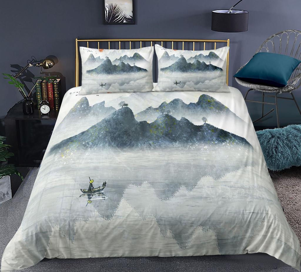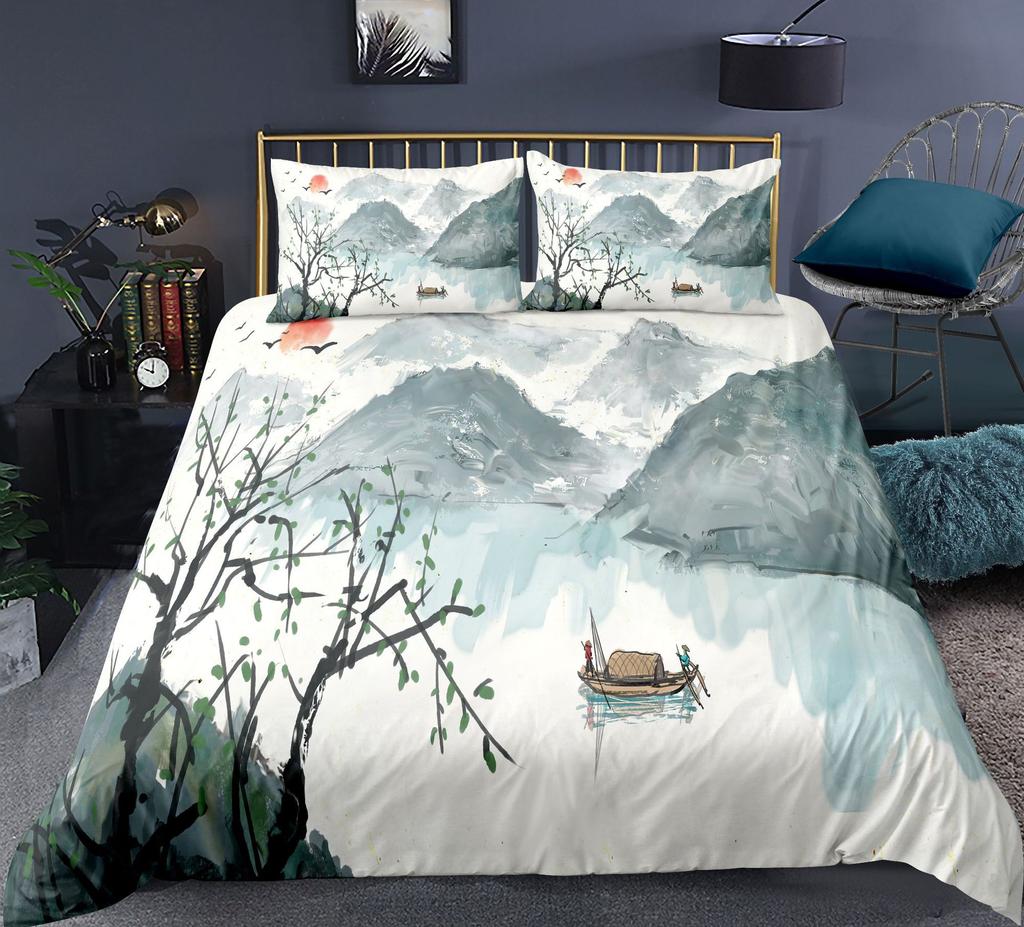 Пододеяльник с изображением природы и пейзажа, размер King/Queen, комплект постельного белья с рисунком китайской тушью, 2/3 предмета из полиэстера, пододеяльник