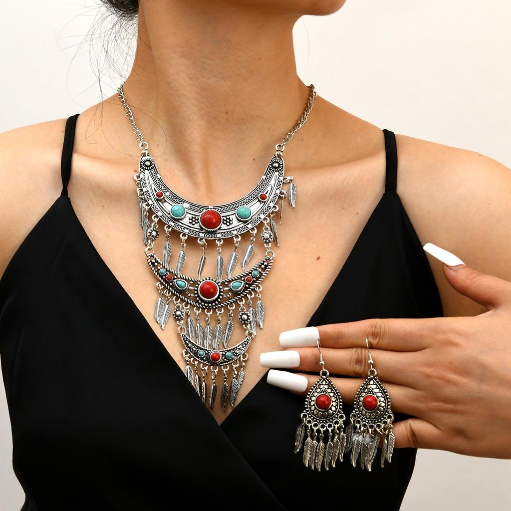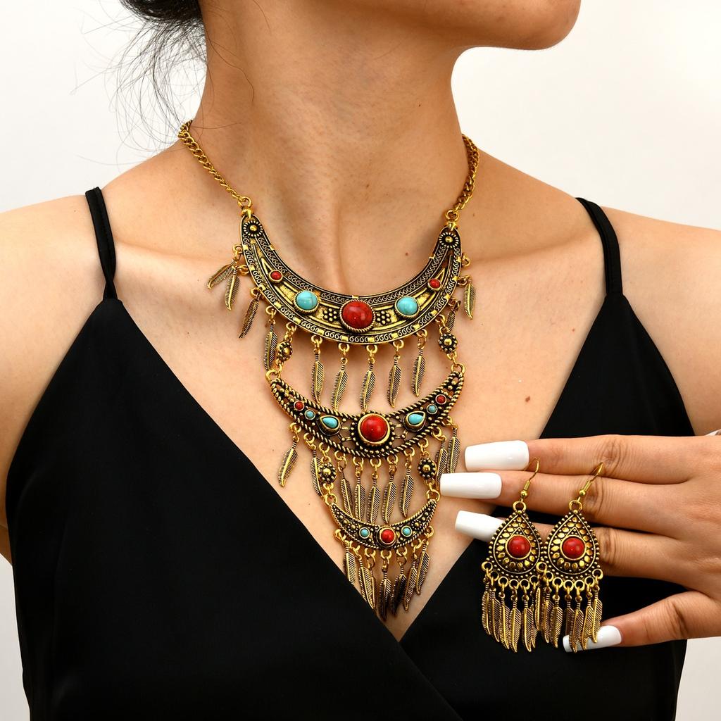 Ожерелье в стиле бохо в этническом стиле, комплект серег, многослойное ретро-ожерелье в виде листьев ханьфу с бахромой, длинная цепочка на ключицу.