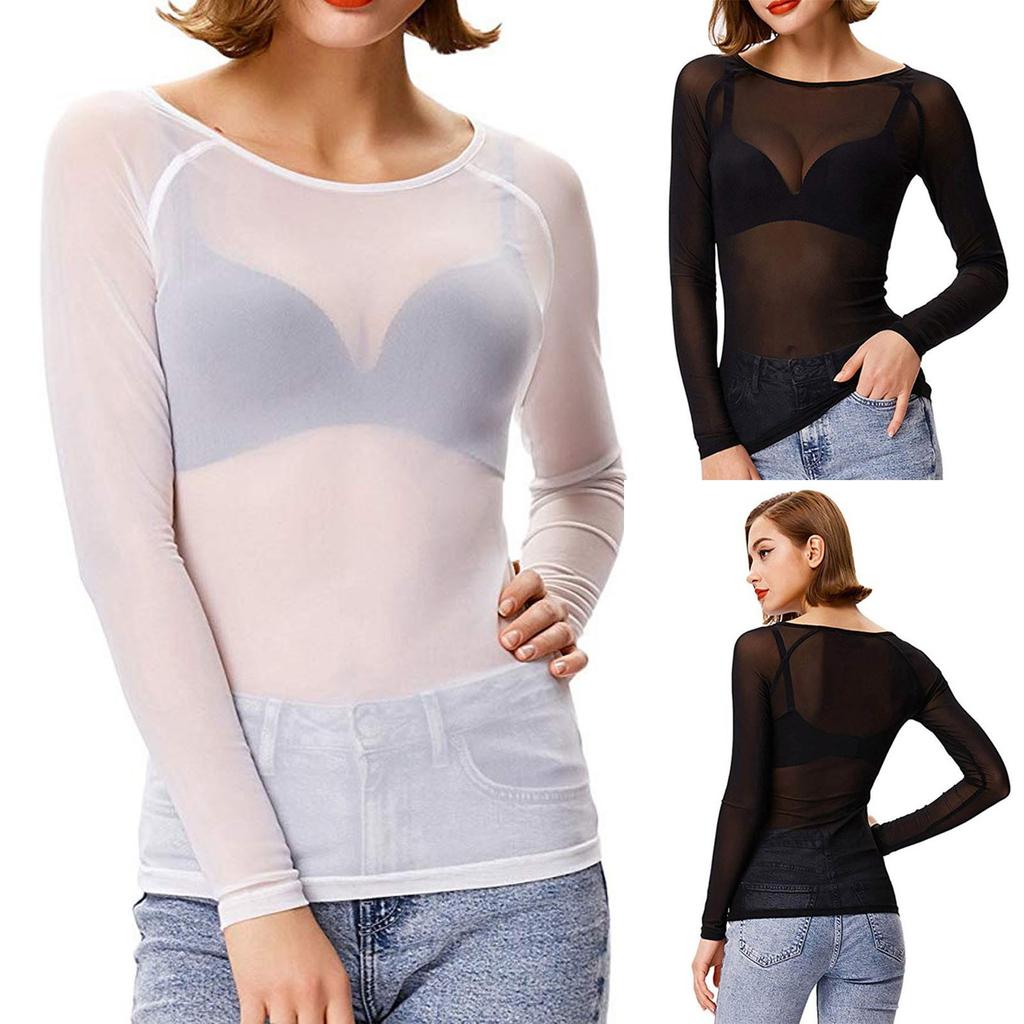 Женские модные тонкие сексуальные однотонные топы из прозрачного тюля и сетки с длинными рукавами — купить товар онлайн с бесплатной доставкой до всему миру!