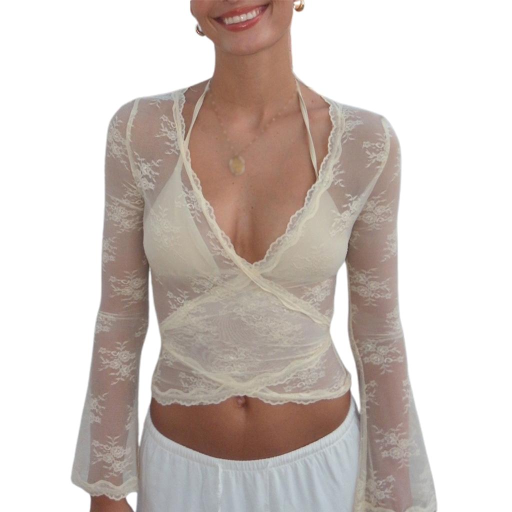 Женские кружевные укороченные топы, повседневные футболки с длинным рукавом, глубоким V-образным вырезом и перекрестными запахами, базовые блузки — купить товар онлайн с бесплатной доставкой по всему миру!