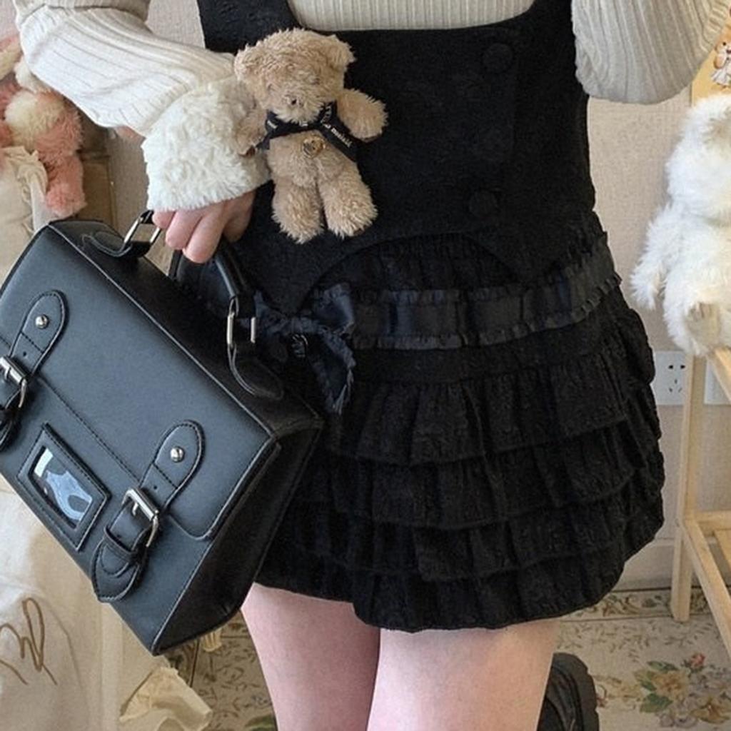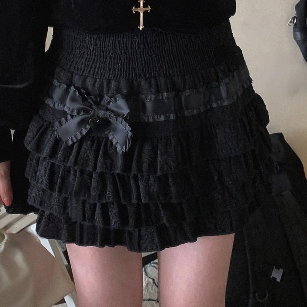 Женские мини-юбки в стиле Лолита, симпатичные юбки с высокой талией и бантом сбоку, многослойные оборки по подолу, короткие юбки А-силуэта