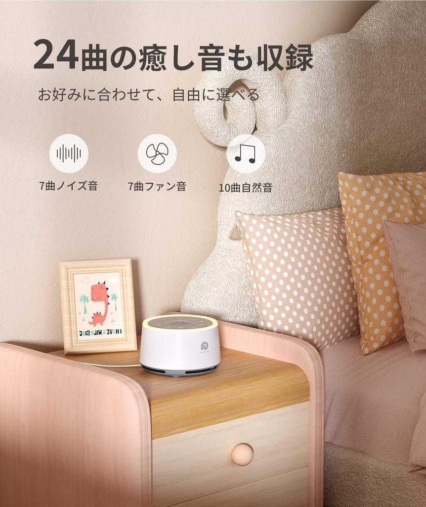[24 типа успокаивающих звуков, способствующих засыпанию] Доступно 24 типа успокаивающих звуков, которые успокаивают разум. Нажмите кнопку «Шум», чтобы выбрать 3 типа розового шума, 3 типа белого шума и 1 тип коричневого шума.. Коротко нажмите кнопку звуков природы, чтобы услышать 10 типов природных звуков. (щебетание птиц, морские волны, журчание реки, мерцающие звезды, музыкальная шкатулка для сна 1, музыкальная шкатулка для сна 2, летний дождь и гром, звуки дождя, крики насекомых, мама) Вы можете выбрать звук внутри утробы. Если нажать кнопку звука вентилятора, можно выбрать 7 типов звуков вентилятора.