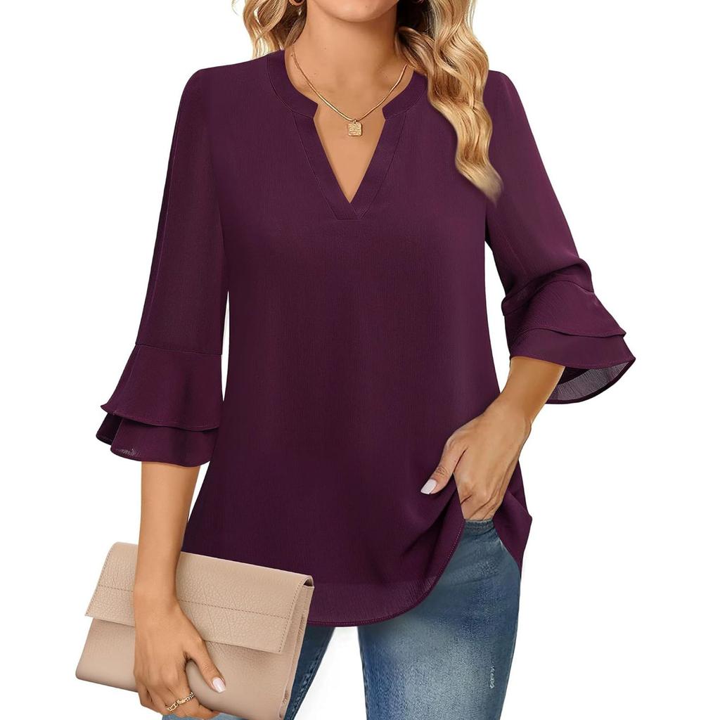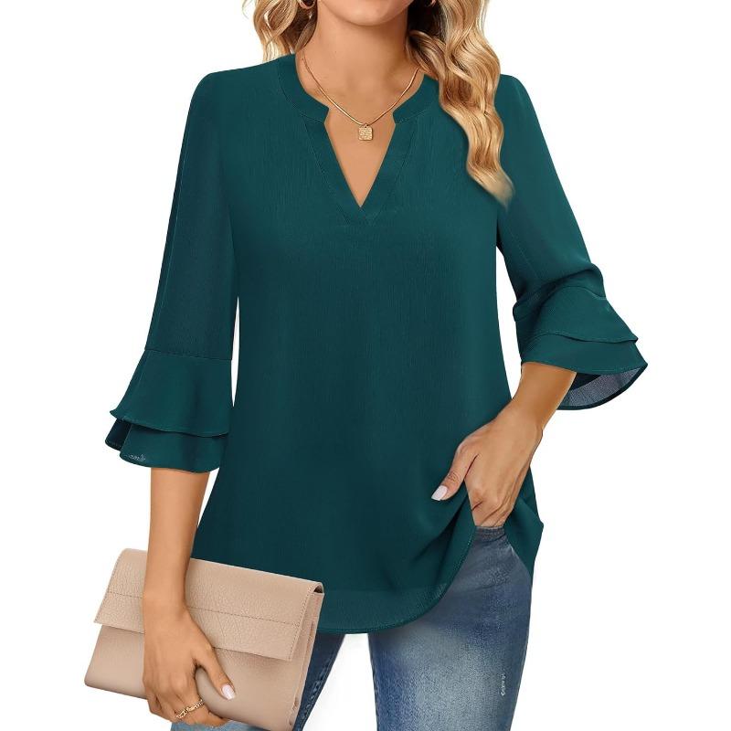 Женская мода повседневная Seven Points расклешенный рукав двухслойный шифоновый однотонный топ с V-образным вырезом на завязках