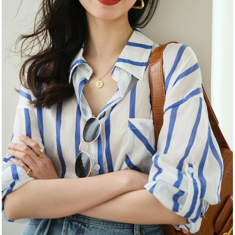 Ретро универсальная рубашка в вертикальную полоску, дизайн Sense Temperament, солнцезащитная блузка, женская тонкая секция, винтажная базовая офисная повседневная женская рубашка
