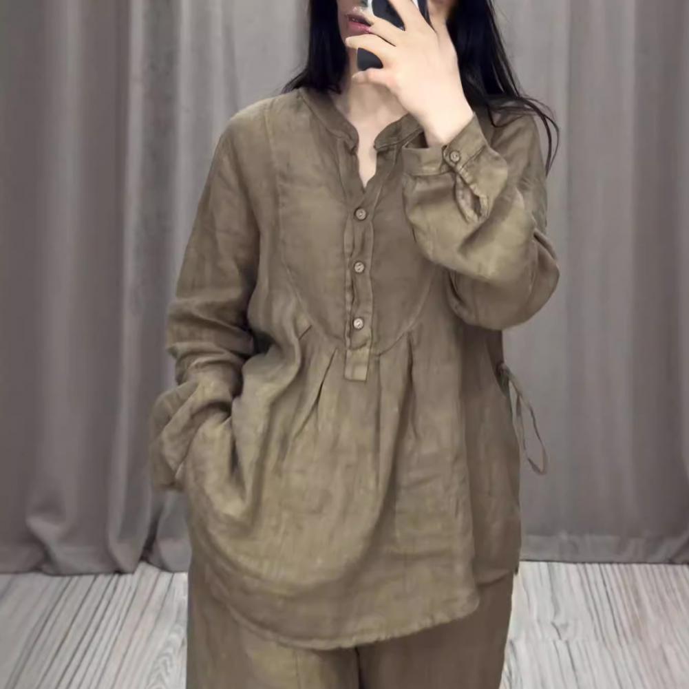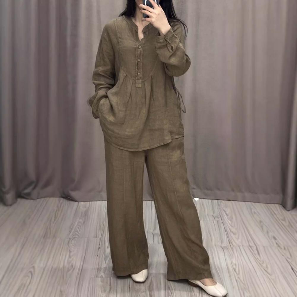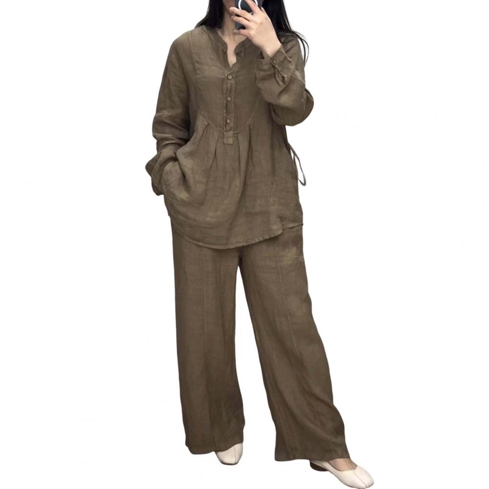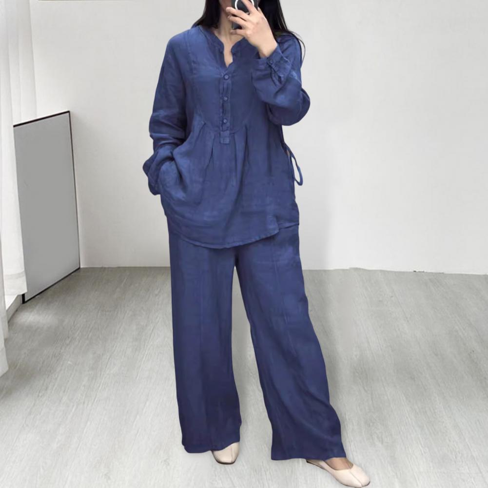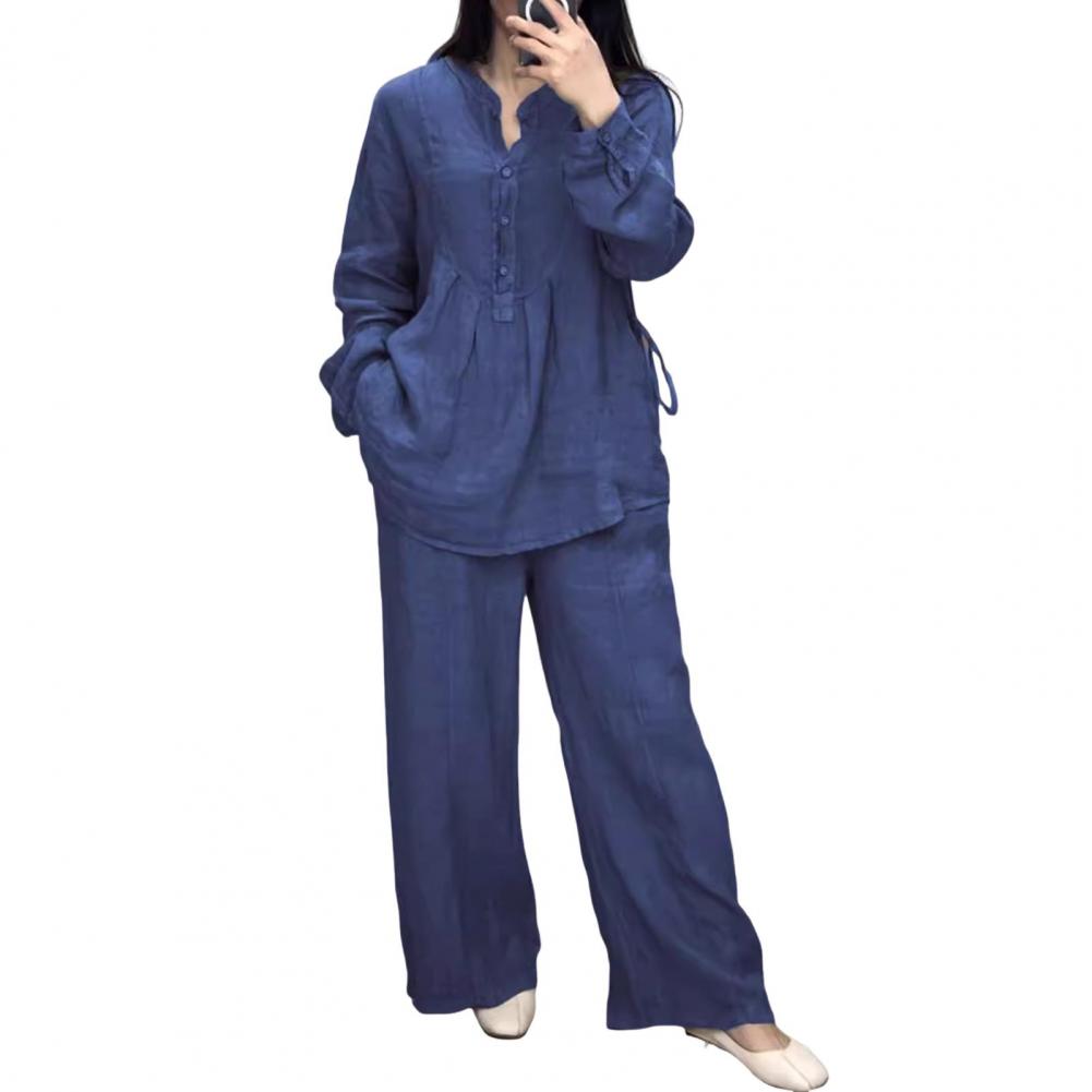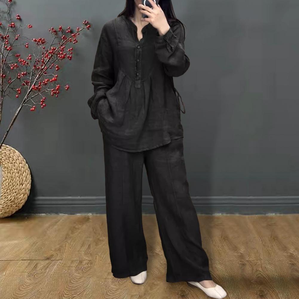 2 шт./комплект женский топ брюки костюм круглый вырез полу однобортный длинный рукав свободная блузка широкие брюки однотонные брюки повседневный брючный костюм спортивная одежда