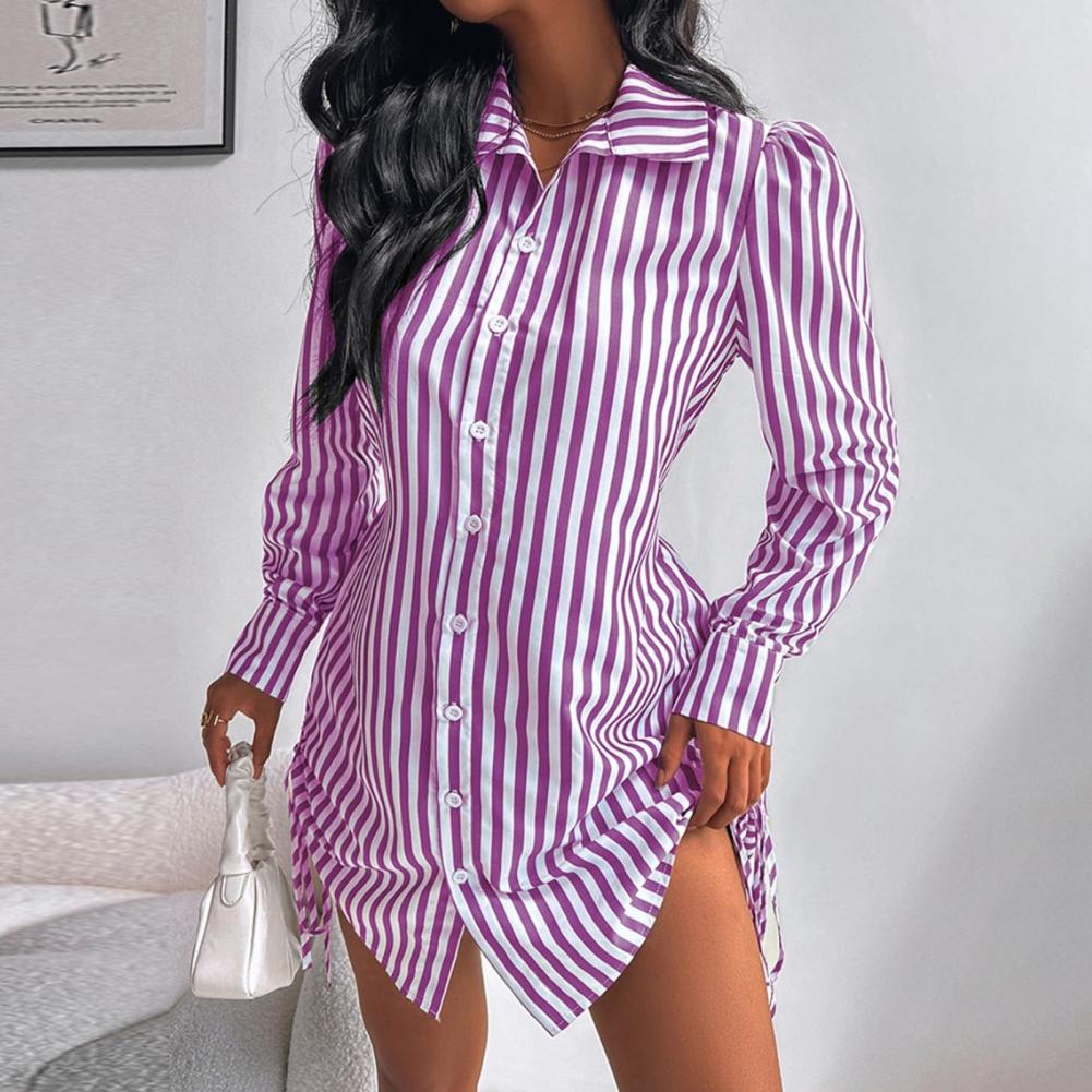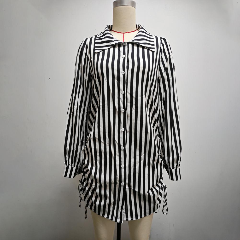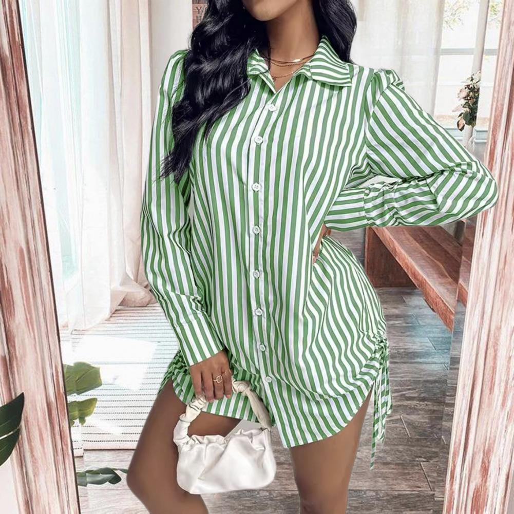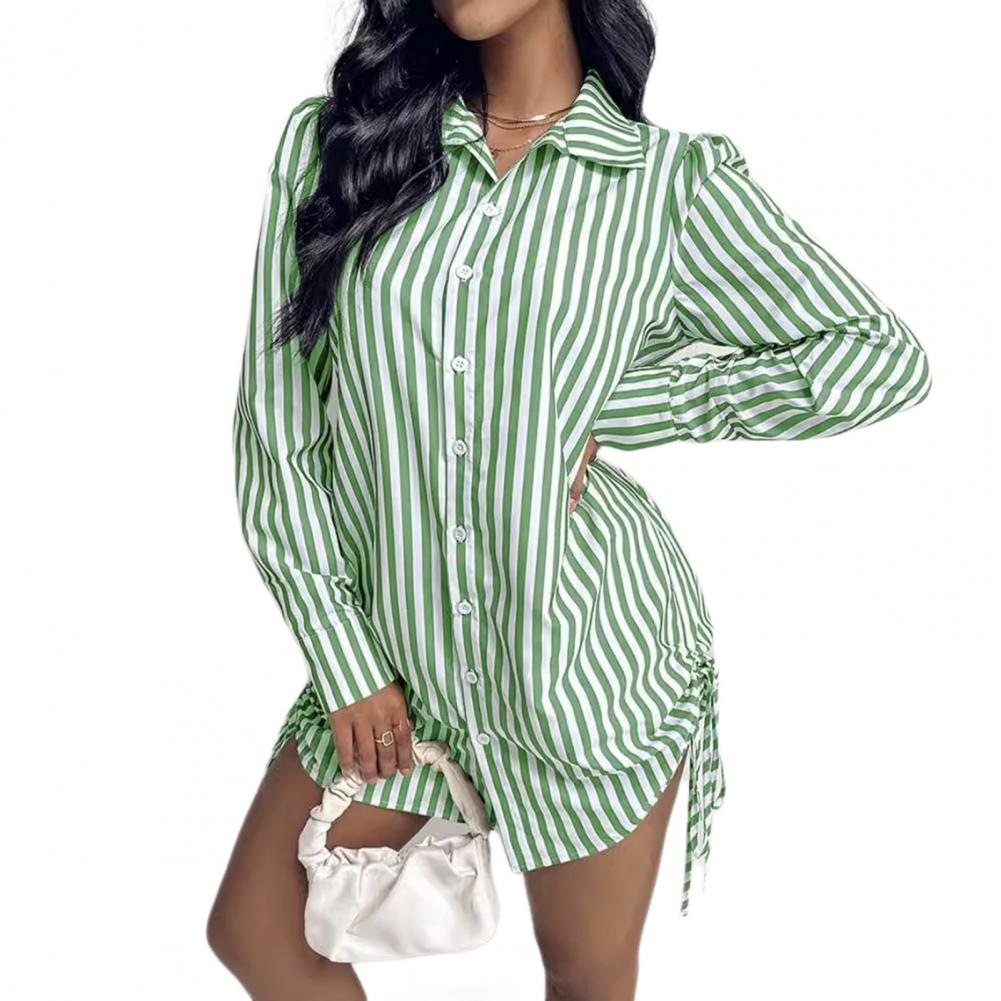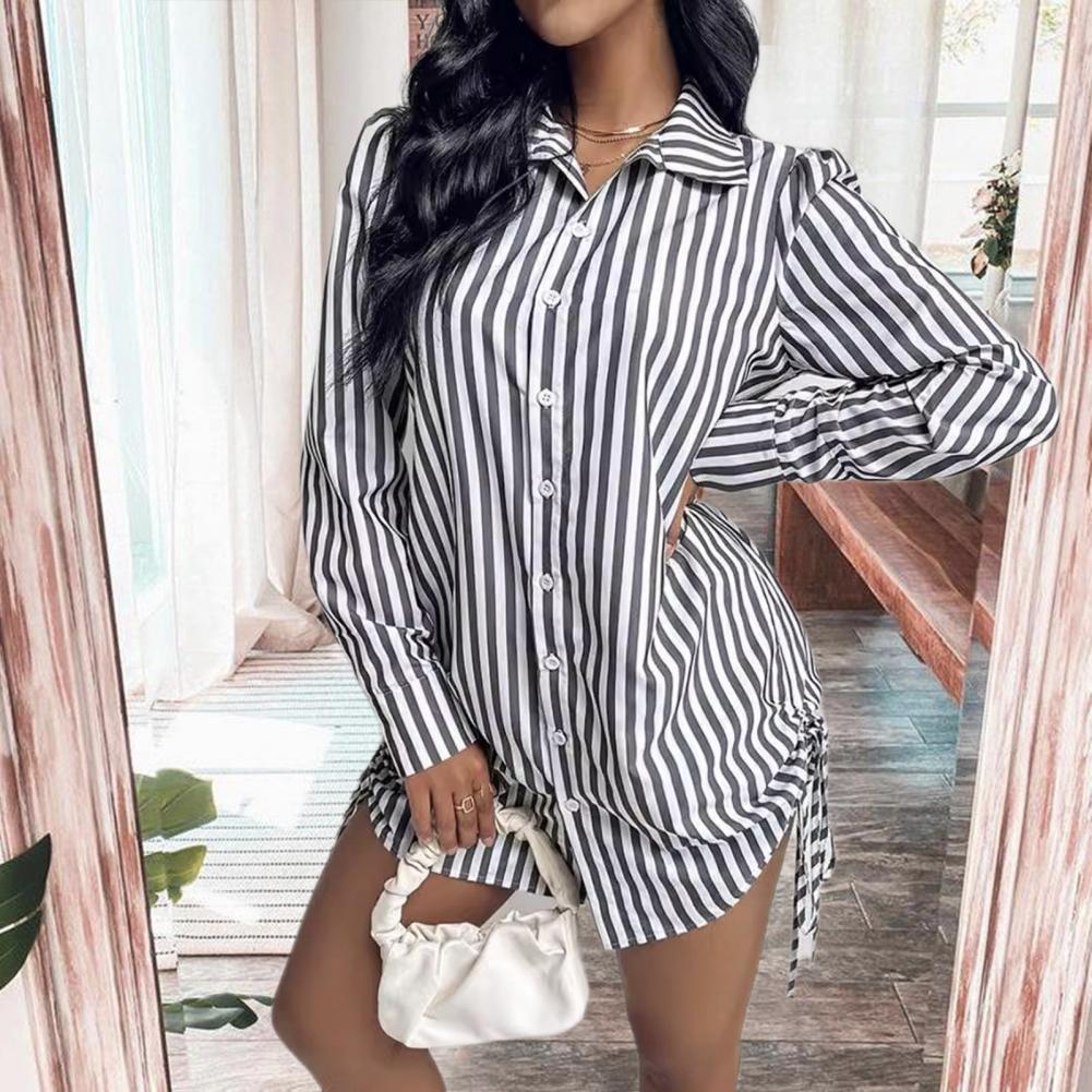 Женское летнее платье-рубашка с лацканами и длинными рукавами, мини-платье с боковым шнурком, однобортное платье-рубашка в полоску с принтом