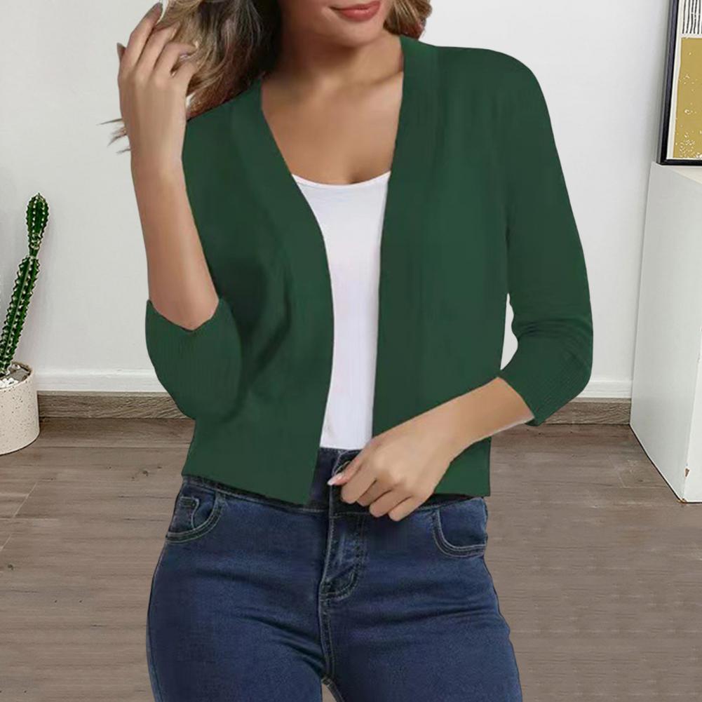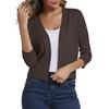 Женский вязаный кардиган без воротника с рукавом 3/4, короткая вязаная куртка, однотонная, открытая строчка, вязаная верхняя одежда
