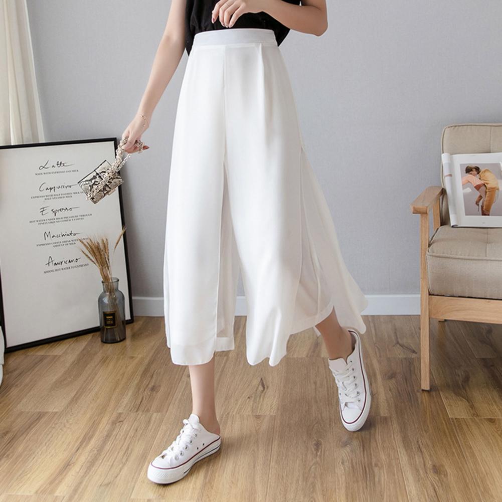 Женская юбка, брюки, эластичные широкие брюки-кюлоты с высокой талией, сплошной цвет, искусственные двойные шифоновые длинные брюки, повседневная одежда