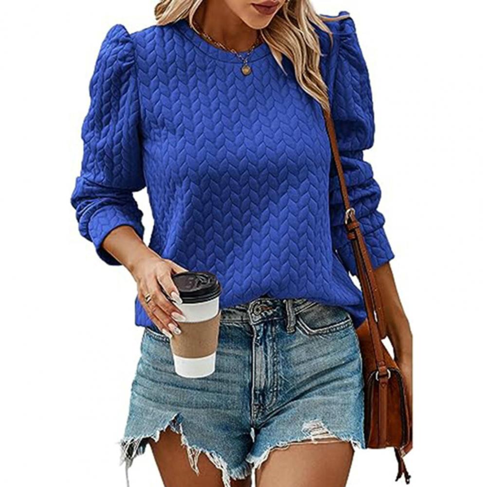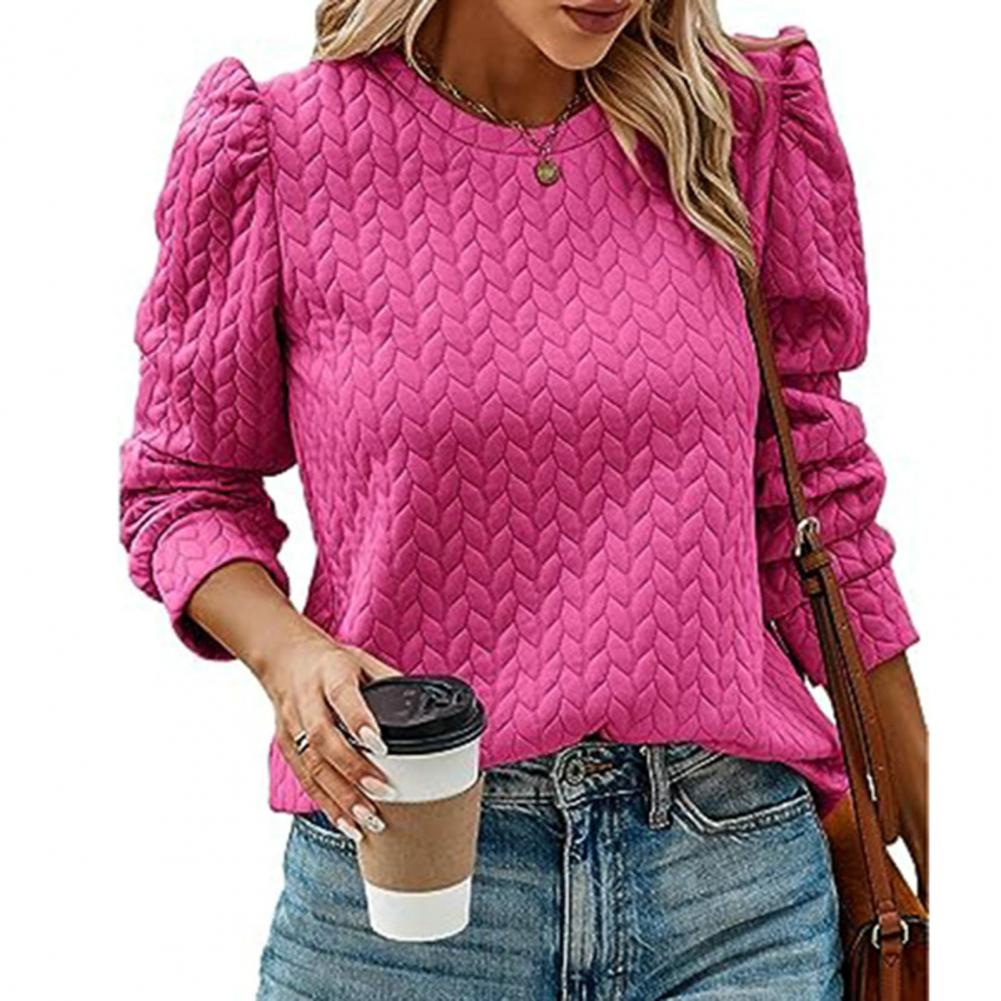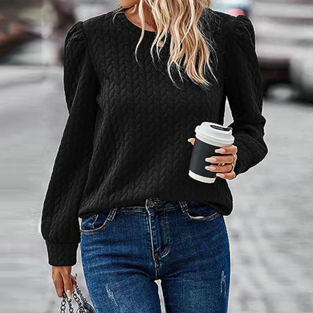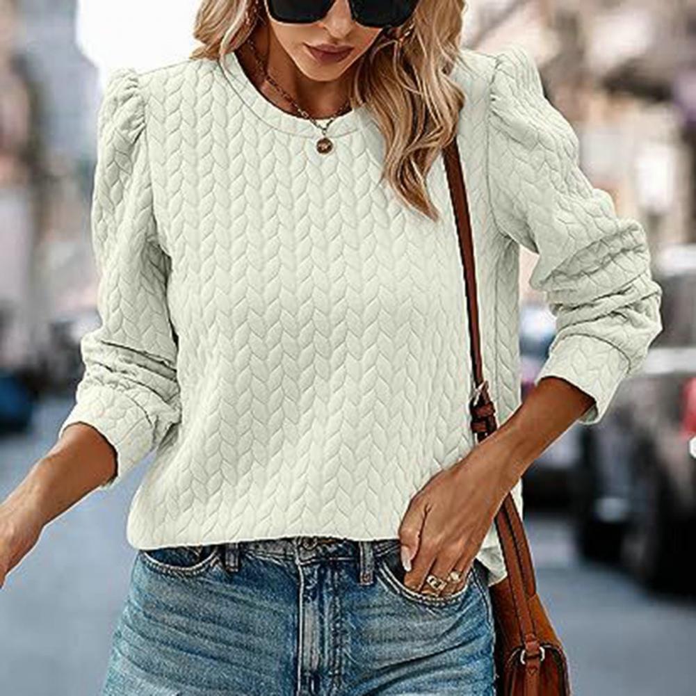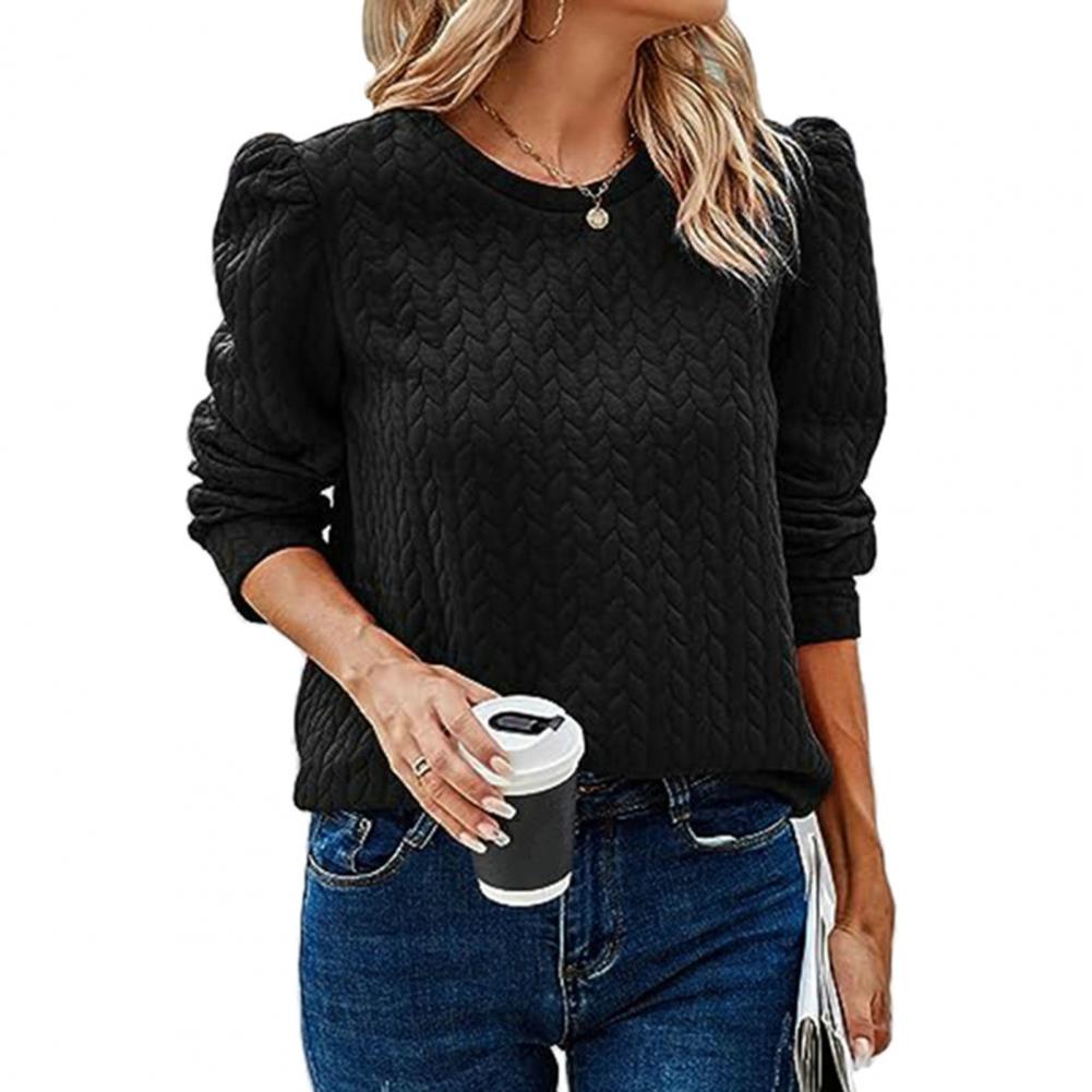 Женский осенне-зимний однотонный свитшот с круглым вырезом, пышным длинным рукавом и текстурой, свободный пуловер, топы, уличная одежда
