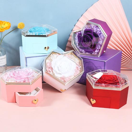 Доступный в ярких цветах, таких как красный, синий и розовый, он идеально подходит для особых случаев, таких как День святого Валентина, дни рождения и годовщины.. Сохраните свою любовь навечно с этой изысканной шкатулкой для украшений из стабилизированных роз.