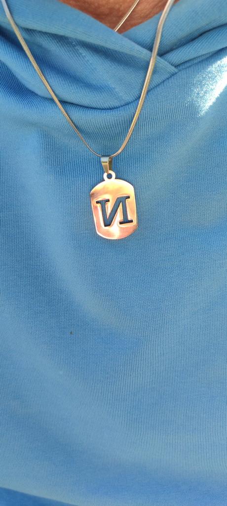 Прикольная подвеска в виде жетона с буквой н на английском либо и на русском как Вам угодно муж попросил заказать ему ну вроде как бы первая буква моего имени Нина. И это очень мило я не смогла ему отказать цепочка очень длинная сантиметров 60 поэтому он повесил жетон на другую цепочку а на этой Я ношу подвеску в виде золотых рыбок