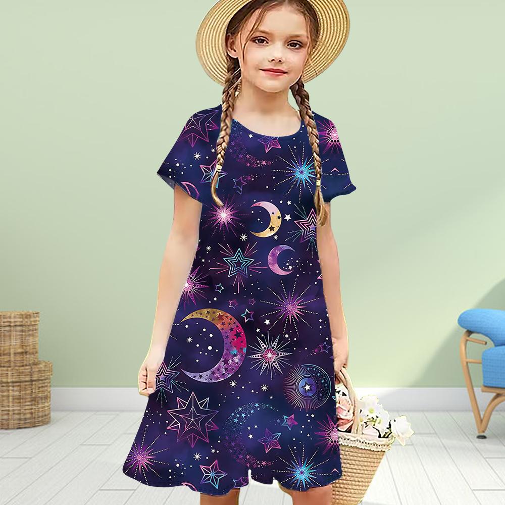 Платья для девочек с 3D-принтом и фиолетовыми звездами, детское праздничное платье для девочек с короткими рукавами, платье принцессы с 3D-принтом