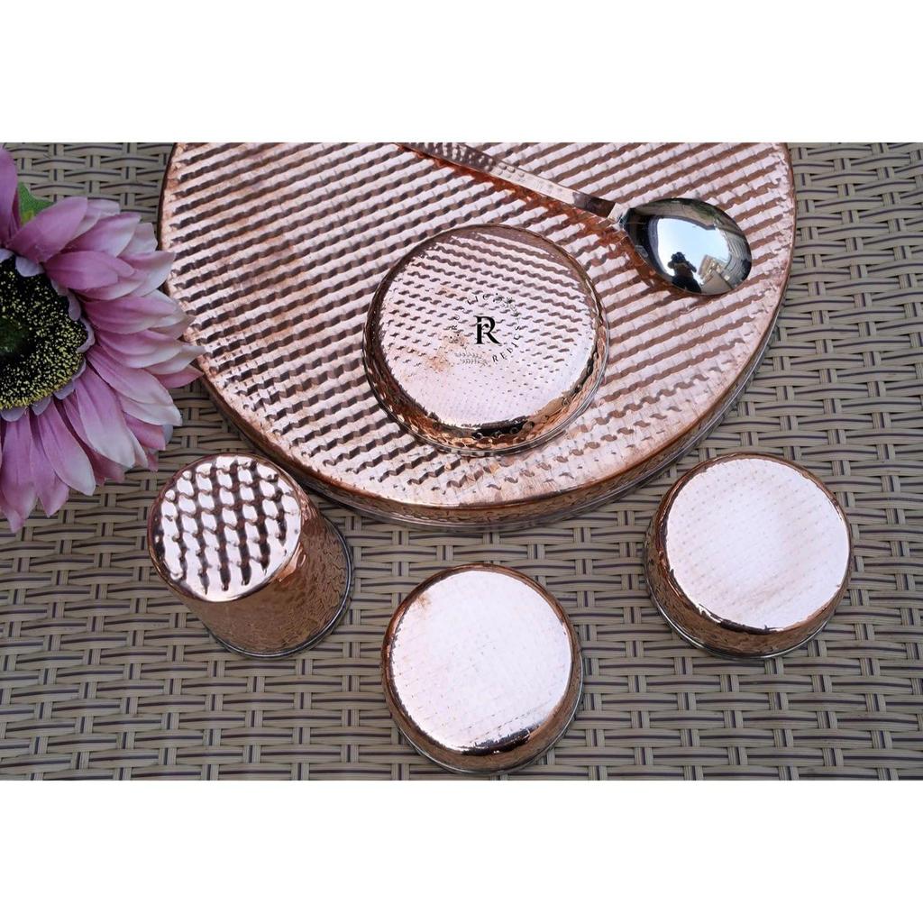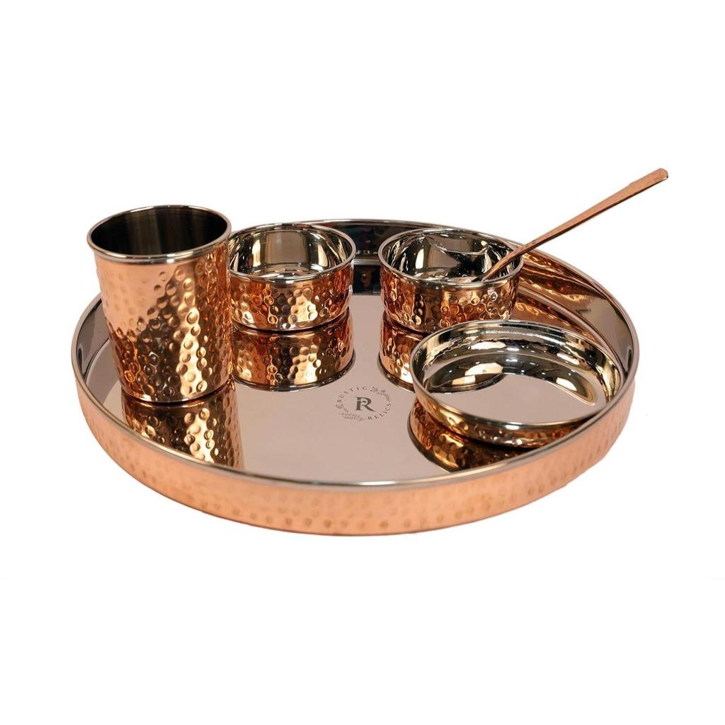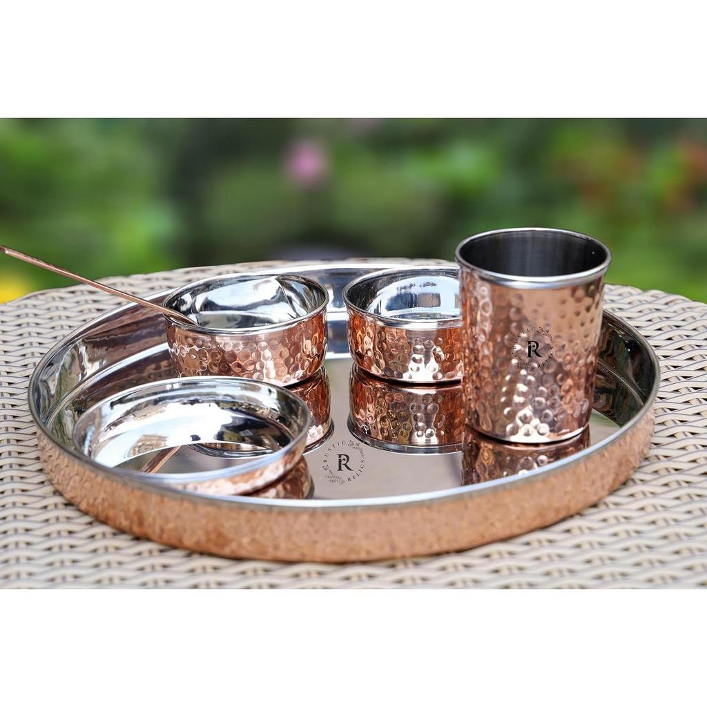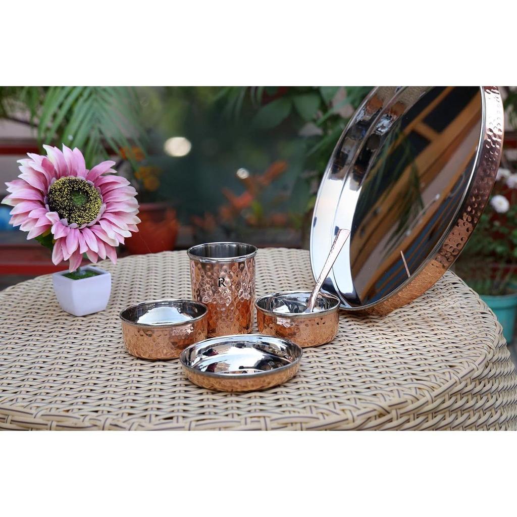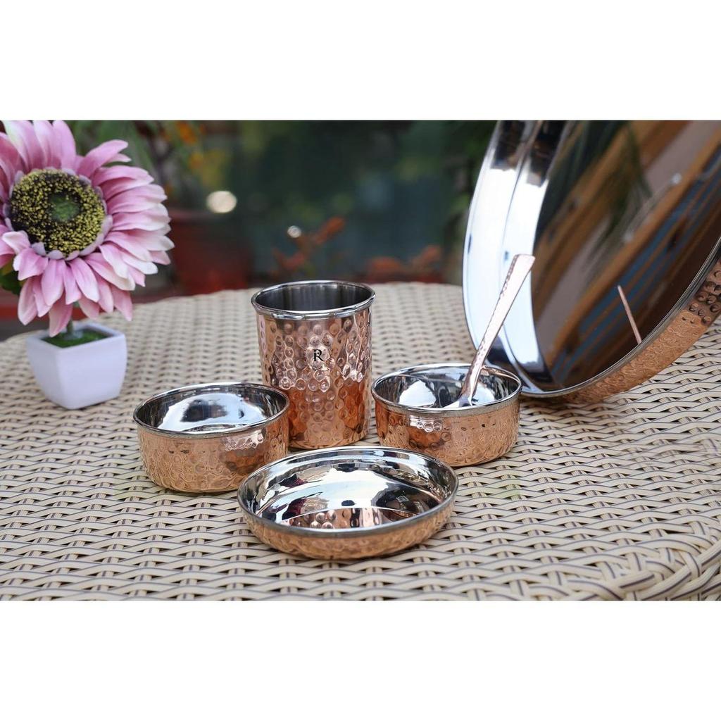 Набор медных кованых тхали - 6 предметов | В набор входит 1 тхали, 2 миски, 1 плоская миска, ложка и стакан
