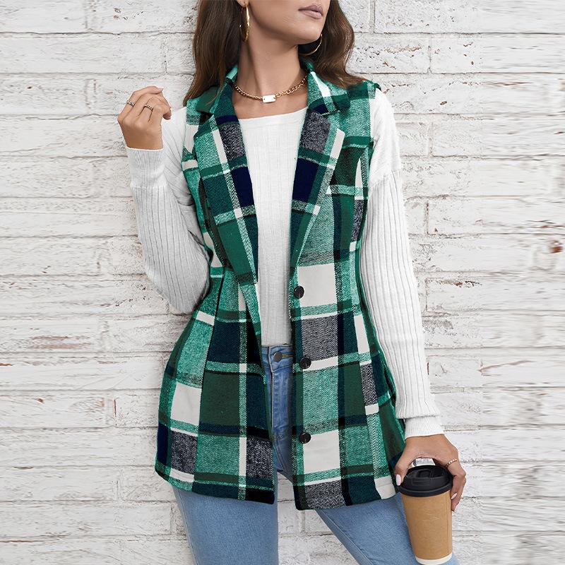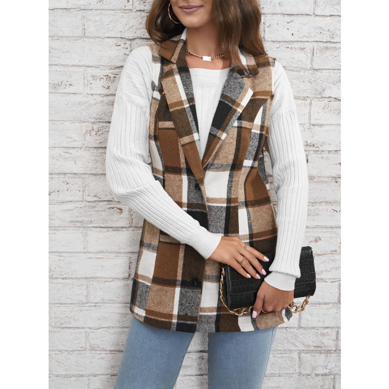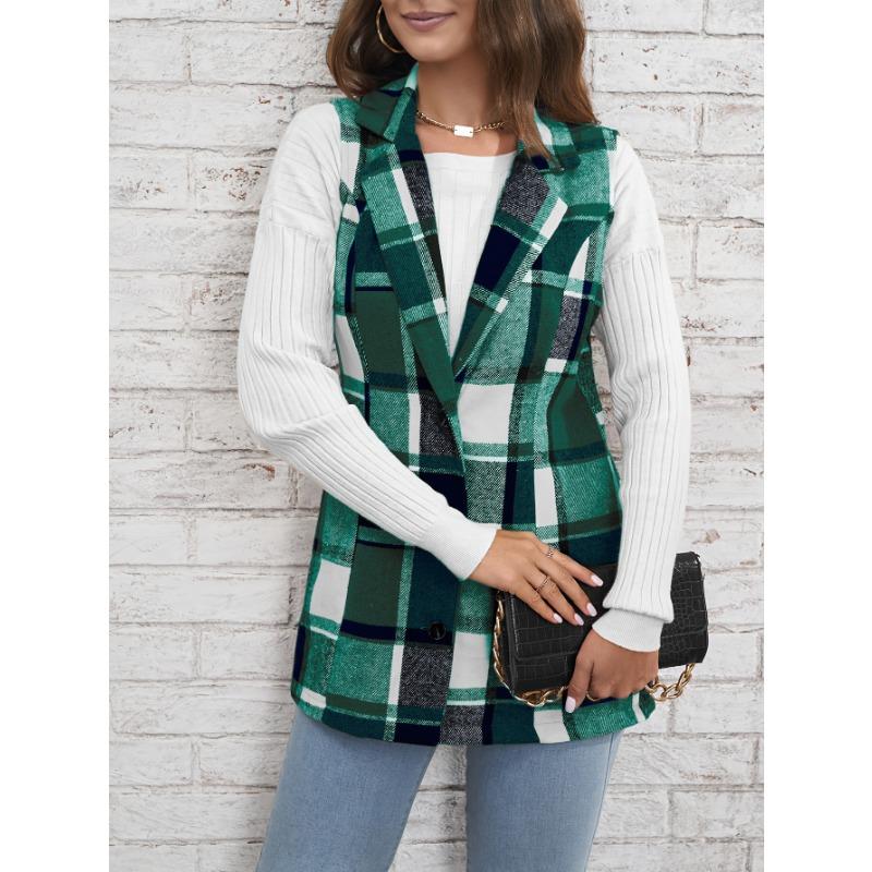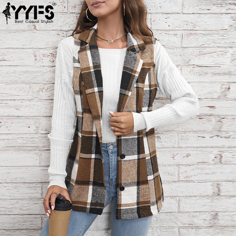 YYFS Женская мода повседневная клетчатая печать осень-зима без рукавов поло воротник куртки и пальто