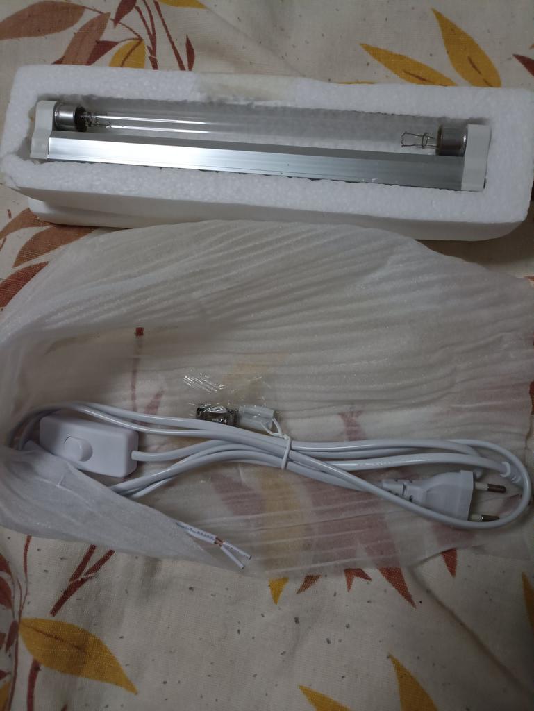 Посылку получила, упакована хорошо, все целое , включили, лампа работает.Есть шнур, а также приспособления для того, чтобы можно было повесить на стену. Очень довольна, магазин и продавца рекомендую.