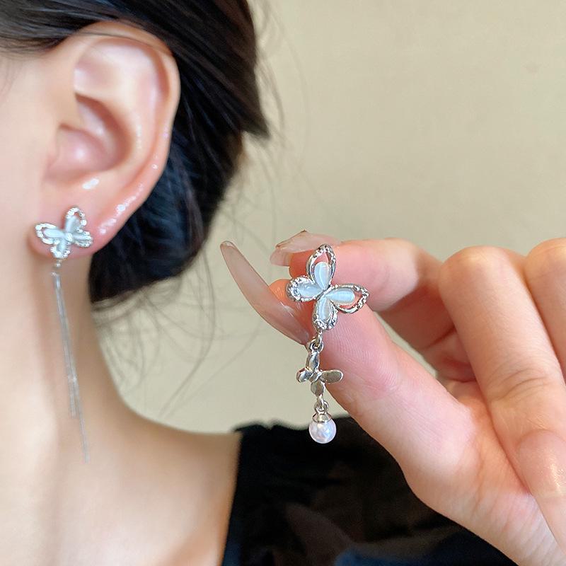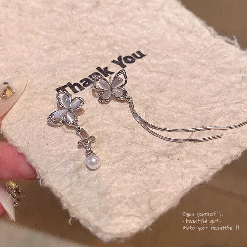 Асимметричные серьги-кисточки из серебра 925 пробы с кошачьим глазом и жемчугом для женщин