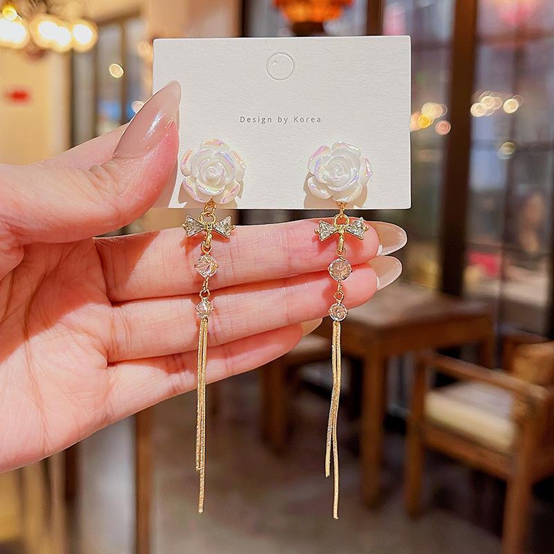 Elegant Camellia Zircon Bow Tassel Earrings with S925 Silver for Women