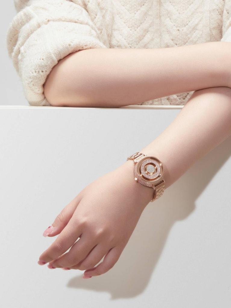 Футуристические женские часы: Две сферы парят над 36-миллиметровым циферблатом, полностью украшенным драгоценными камнями, с 12-миллиметровым регулируемым быстросъемным ремешком.. *Внутренняя сфера = минутная стрелка, внешняя сфера = часовая стрелка.