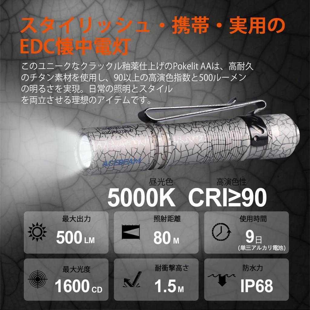 Фонарик ACEBEAM Pokelit AA, совместимый с батареями AA, титановый светодиод 519A, высокая цветопередача Ra90, маленький, легкий, мощный, 500 люмен, IP68