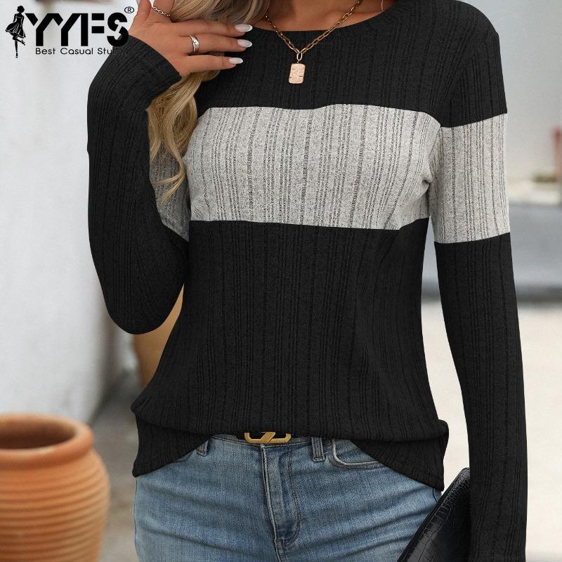 YYFS Женские модные повседневные весенне-осенние блузки и рубашки с круглым вырезом и длинными рукавами с цветными блоками и принтом