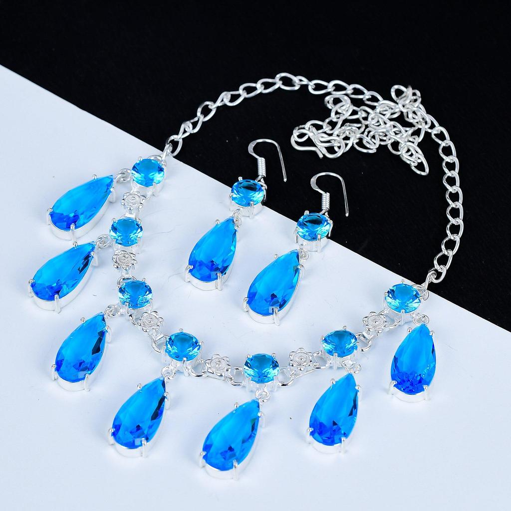Комплект из ожерелья и серег из серебра 925 пробы с голубым топазом ручной работы