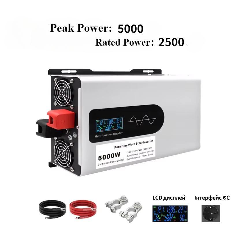 Инвертор мощностью 5000 Вт, постоянная мощность 2500 Вт, пусковая мощность 5000 Вт.