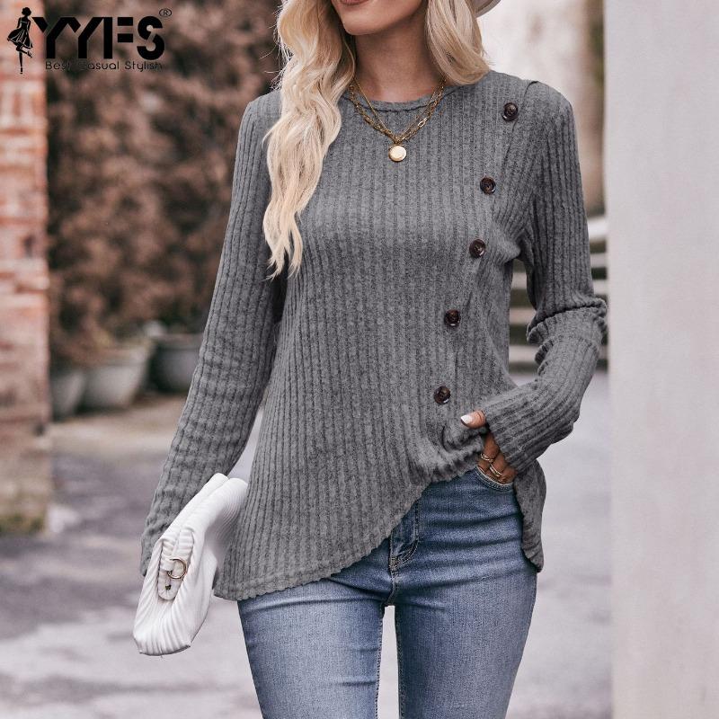 YYFS Женские модные повседневные весенне-осенние однотонные блузки и рубашки с круглым вырезом с длинными рукавами и принтом