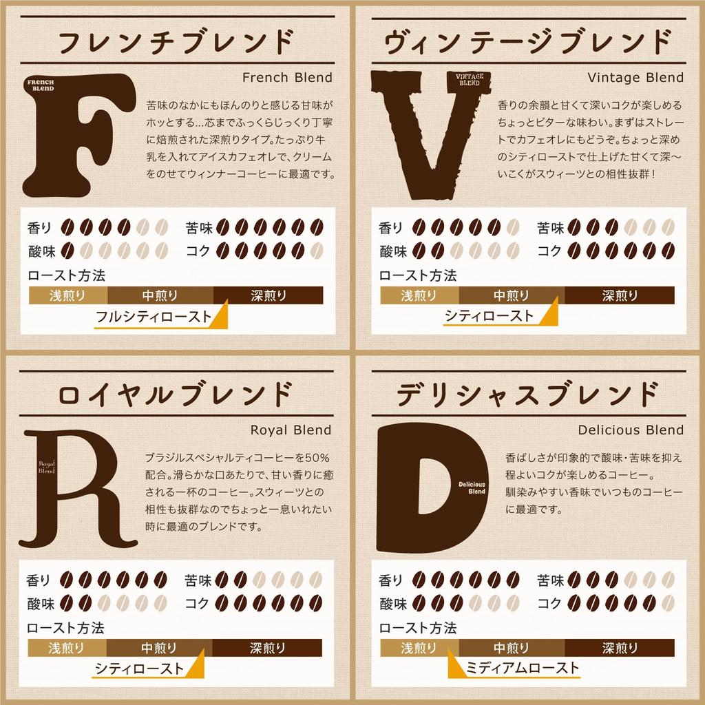 [Сравните 7 видов смесей] Кофейные смеси с разными вкусами и ароматами расфасованы в порции по 100 г.. Вкусная смесь: Обладает впечатляющим ароматом, подавляет кислотность и горечь и обладает оптимальной степенью насыщенности.. / Французская смесь: Темный обжаренный сорт с горьковатым вкусом и легкой сладостью.