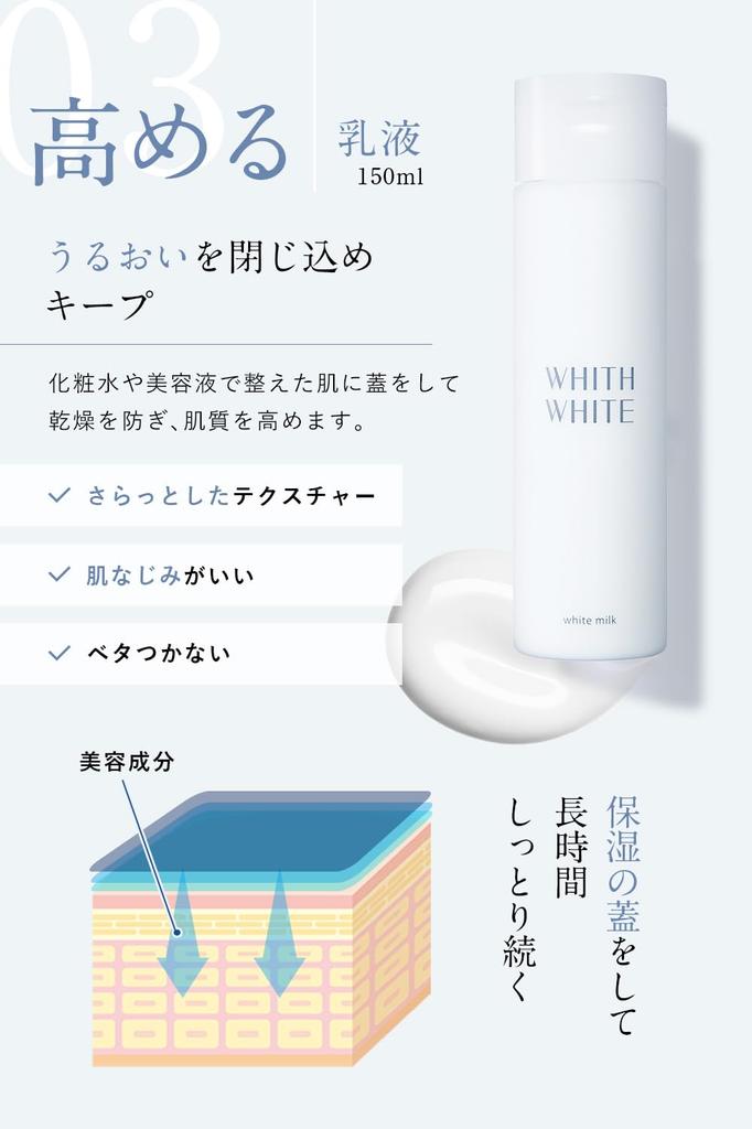 🌞 [3STEP Luxury Set] Для тех, кто ищет основательный отбеливающий уход от средств по уходу за кожей WHITH WHITE, в этот набор входят 3 лечебных базовых косметических средства: Лосьон 200 мл, сыворотка 50 мл и эмульсия 150 мл. 🌞 [Меры по борьбе с пятнами] Три квазилекарственных продукта, содержащие два типа активных ингредиентов, одобренных Министерством здравоохранения, труда и социального обеспечения. Мы стремимся к красивой коже с помощью «водорастворимого экстракта плаценты», который подавляет выработку меланина и предотвращает появление пятен и веснушек, а также «глицирризиновой кислоты 2К», которая подавляет такие проблемы с кожей, как акне, и сохраняет кожу здоровой.. 🌞 [Пробуждает ощущение свежести и прозрачности] Глубоко заряжает свежестью растений кожу, которая испытывает множество колебаний, таких как сухость, жесткость и неровная текстура, придавая ей ощущение ясности и прозрачности.. 🌞 [Элегантный цветочный аромат] Свежие и освежающие верхние ноты «лимона, листовой зелени и лесной зелени» сочетаются с элегантными и привлекательными средними нотами «ландыша, розы и жасмина». Последние ноты — «мускус, ирис и гвоздика», создавая великолепный и нежный аромат.. 🌞【Как использовать ШАГ 1】 После очищения кожи путем умывания лица,