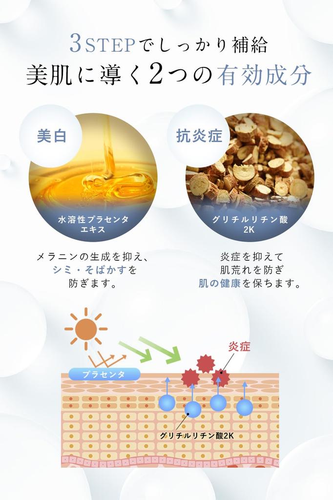 🌞 [Меры по борьбе с пятнами] Три квазилекарственных продукта, содержащие два типа активных ингредиентов, одобренных Министерством здравоохранения, труда и социального обеспечения. Мы стремимся к красивой коже с помощью «водорастворимого экстракта плаценты», который подавляет выработку меланина и предотвращает появление пятен и веснушек, а также «глицирризиновой кислоты 2К», которая подавляет такие проблемы с кожей, как акне, и сохраняет кожу здоровой.