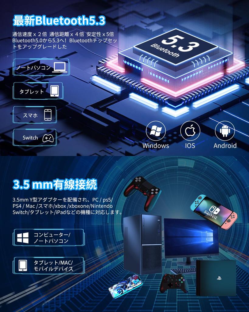 [Bluetooth 5.3 беспроводной/3.5 мм проводной двойной режим использования] Эта игровая гарнитура оснащена кабелем Bluetooth 5.3/3.5 мм и может использоваться как для проводного, так и для беспроводного использования.. Bluetooth 5.3 обеспечивает большую дальность соединения и более стабильную скорость передачи данных.. Беспроводное подключение гарнитуры позволяет переключаться между игровым режимом с малой задержкой и режимом воспроизведения музыки высокого качества Hi-Fi.. Игровые режимы с низкой задержкой обеспечивают быструю игру на вашем устройстве. Расстояние приема около 15 м, вы также можете слушать музыку или разговаривать с друзьями.. [проводное соединение 3,5 мм] PS4/5, Switch, ПК, Xbox, Xboxone *Обратите внимание: Несовместимо с игровыми консолями Bluetooth и Xbox.. Если вы хотите использовать его с проводной игровой консолью Xbox, вам понадобится адаптер-конвертер гарнитуры. (приобретается отдельно). [Подключение Bluetooth 5.3] Смартфоны, iPad, ноутбуки, ПК и устройства, которые можно подключить через Bluetooth.
