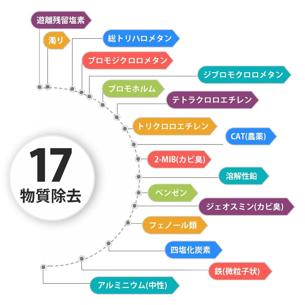 [Удаление 17 веществ] Свободный остаточный хлор, мутность, общий тригалометан, бромдихлорметан, дибромхлорметан, бромоформ, тетрахлорэтилен, трихлорэтилен, CAT (пестициды), 2-МИБ (запах плесени), растворимый свинец, бензол, геосмин (запах плесени) ), фенолы, четыреххлористый углерод, железо (мелкие частицы), алюминий (нейтральный)