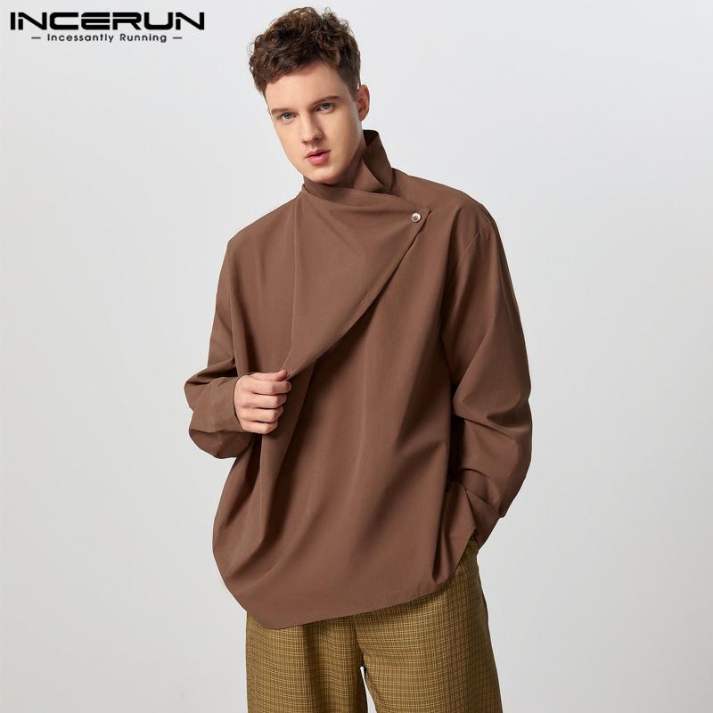 INCERUN Мужские футболки с длинным рукавом и воротником-стойкой с боковыми пуговицами