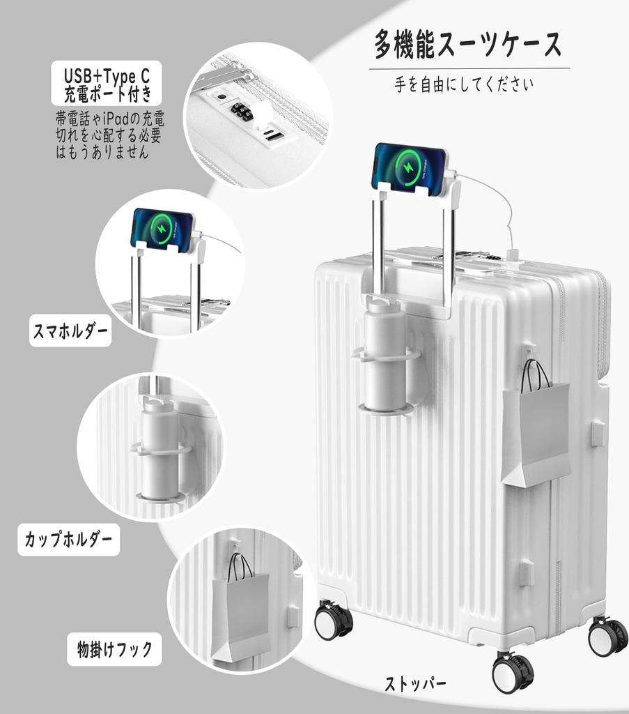 [С фиксатором колес, портом зарядки USB + Type C, подстаканником и держателем для смартфона] Это усовершенствованная модель серии ASHARD с открытым передним расположением.. Пробка (тормоз) функция позволяет ему стоять самостоятельно, даже если поезд трясется во время движения. Стопор можно немедленно отпустить при посадке или высадке из поезда, а также при выходе из него или занятии места, чтобы вы могли плавно возобновить движение.. В чемодане есть карман для хранения вашего мобильного телефона, а порт зарядки USB + Type C расположен снаружи, поэтому вы можете заряжать его в любое время и в любом месте.. В комплекте удобный складной держатель для напитков.. Подстаканник, чашку для молочного чая, зонтик можно разместить в любое время, что сделает ваше путешествие более удобным. К верхней части рычага прикреплен держатель для смартфона, так что вы можете освободить руки во время ожидания рейса и расслабиться в пути.