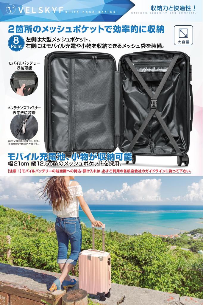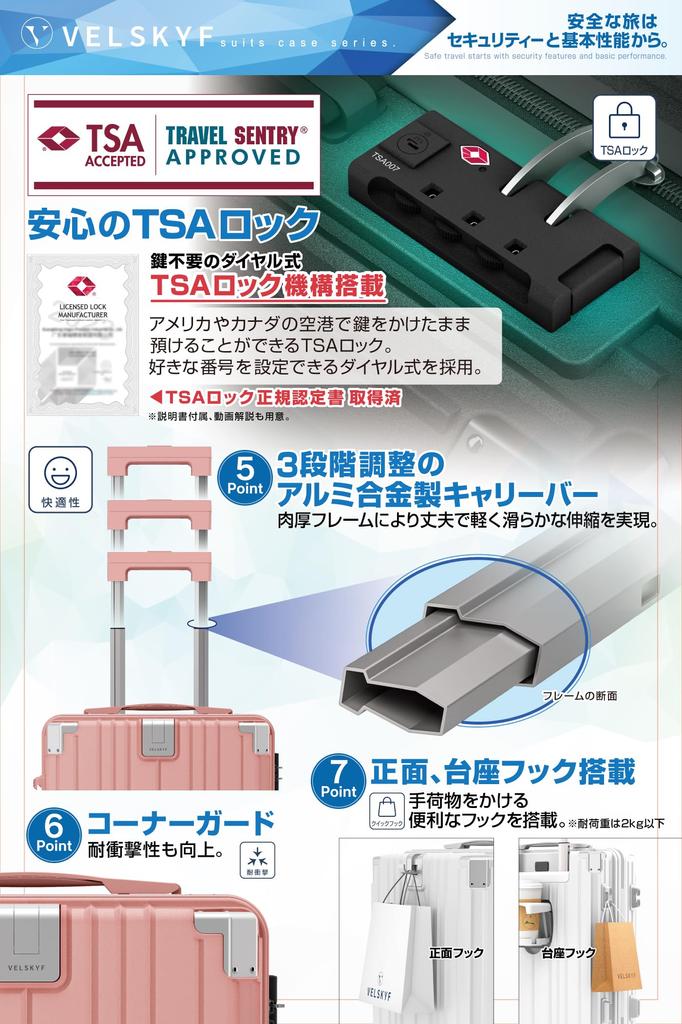 [Замок TSA с дисковым кодом] Замок с дисковым кодом, для которого не требуется ключ, установите 3-значный PIN-код, чтобы вам не пришлось беспокоиться о потере ключа [Пожизненная гарантия на указанные детали, если новые детали неисправны] У VELSKYF есть ручки для переноски, ролики, У нас нет гарантийного срока на четыре элемента, ручку и замок TSA, но мы обеспечим внутреннюю поддержку. *Ограничено случаями, когда в процессе производства возникли повреждения или дефекты.. [Инструкции по настройке замков TSA и т.п.. включено *Видеообъяснение включено] В комплект входит подробное руководство по эксплуатации с видео и иллюстрациями, а также простой для понимания метод первоначальной настройки замка TSA. Это объясняется в видео, а также объясняются названия каждой части.. [Защищает от ударов и царапин] Оснащен угловыми защитными накладками, которые поглощают удар и защищают содержимое, не деформируясь даже при падении. Поверхность основного блока шероховатая.. Матовый дизайн защищает от царапин