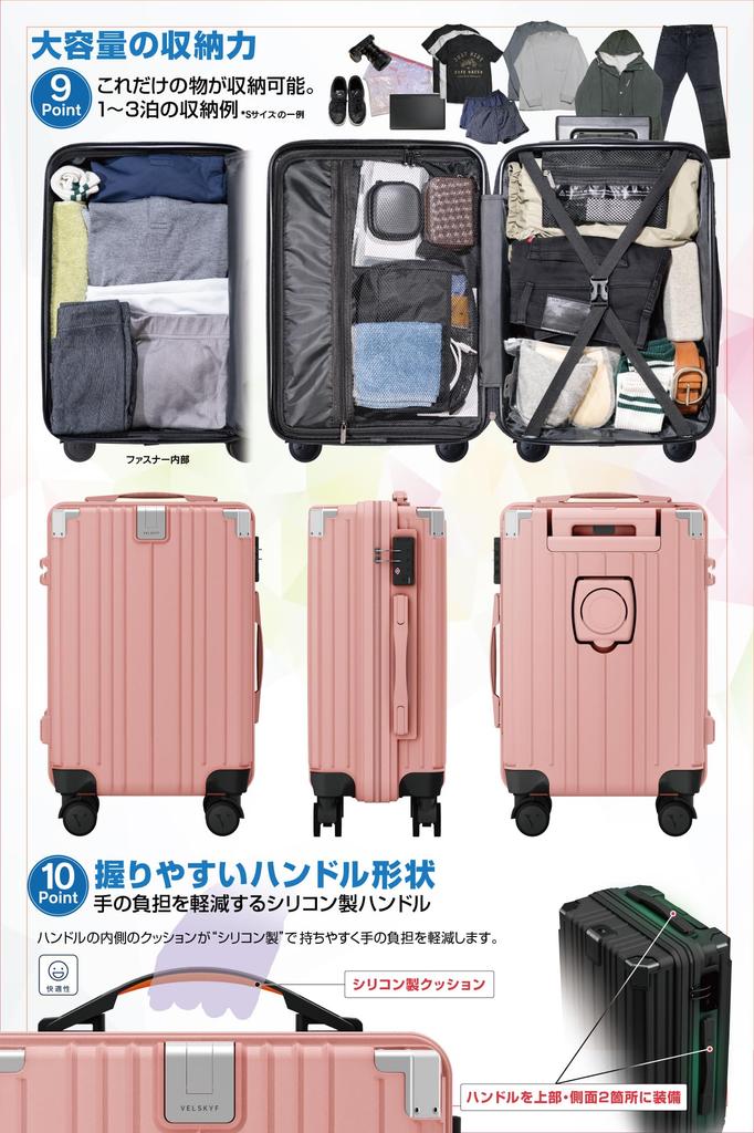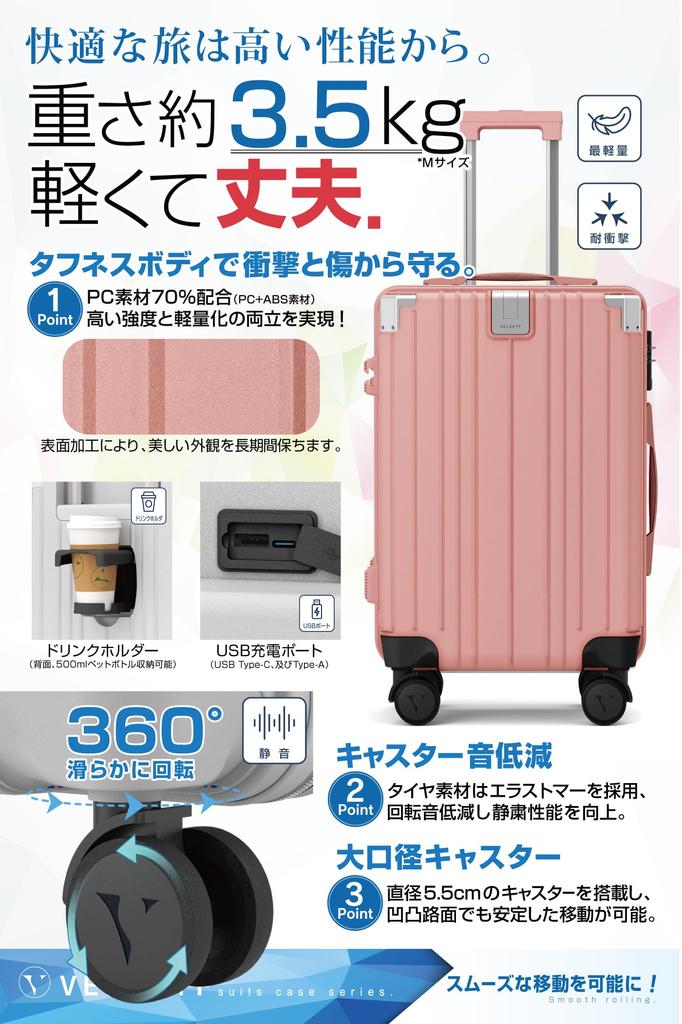 [Удивительно легкий и прочный корпус] Размер S 2,8 кг Размер M 3,5 кг Когда вы берете его в руки, он настолько легкий, что вы не можете не почувствовать его прочность, изготовлен из смеси 70% поликарбоната (поликарбонат) + 30% АБС-смолы. [Снижение шума от колес] Для колес используется специальный материал, снижающий шум трения даже на асфальте, а устойчивые двойные колеса и колеса большого диаметра позволяют машине плавно двигаться даже по неровным дорогам.. Увеличивая диаметр колес, мы учитывали не только эксплуатационные характеристики, но и скорость их износа.. Ролики VELSKYF диаметром 55 мм совершают примерно на 2200 оборотов на километр меньше, чем обычные ролики диаметром 40 мм, что снижает вероятность их износа.