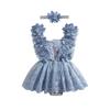 Летний наряд для девочки, комбинезон с цветочной вышивкой, завязками, сетчатым платьем, бантом, повязкой на голову, комплект из 2 предметов