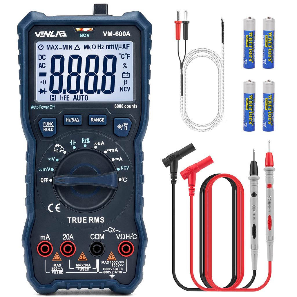 【Многофункциональный】Цифровой мультиметр VENLAB VM600A измеряет переменное напряжение до 750 В, постоянное напряжение до 1000 В, переменный/постоянный ток до 20 А и сопротивление до 60 МОм.. Электрические тестеры также могут измерять температуру, емкость, частоту, рабочий цикл, включение/выключение проводов, целостность цепи и диоды.