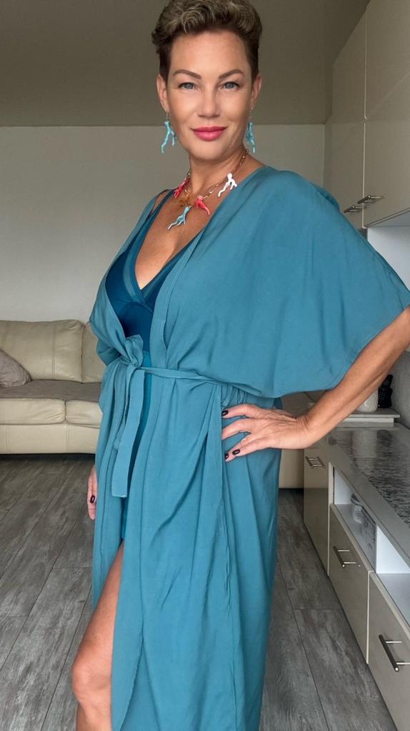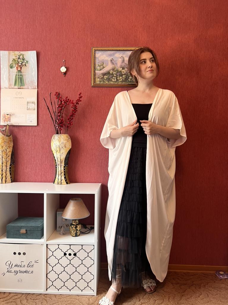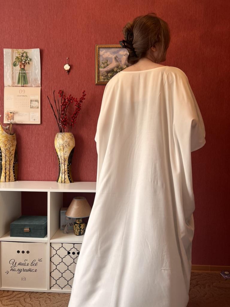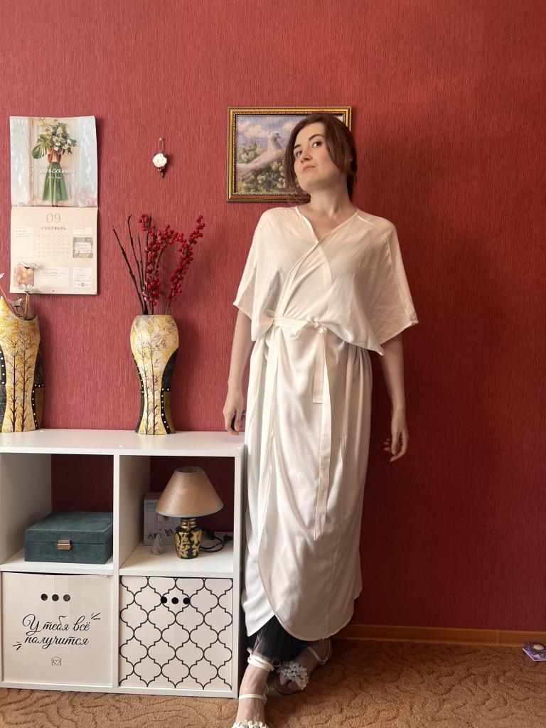 Нежная вуаль для пляжа 🏖️ Хотя в городских образах будет смотреться не менее прекрасно. 100% вискоза, которую легко перепутать с хлопком. Такая же дышащая. Так же хорошо мнется 😂 Рукав до локтя. В комплекте поясок. Ткани много, она окутывает, будто облачко. Мой рост - 165 см.