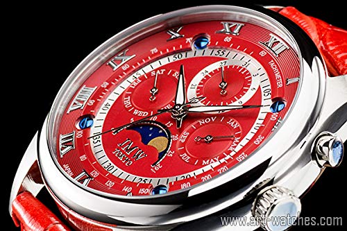 [Механизм японского производства] На этот раз от "JMW (Япония Движение Watch)«бренд, который уделяет особое внимание механизмам японского производства, мы представим яркий механизм, оснащенный «фазой Луны», которая отображает возраст Луны, римским цифровым индексом и функцией тахиметра.. Он имеет роскошный дизайн с красным циферблатом.