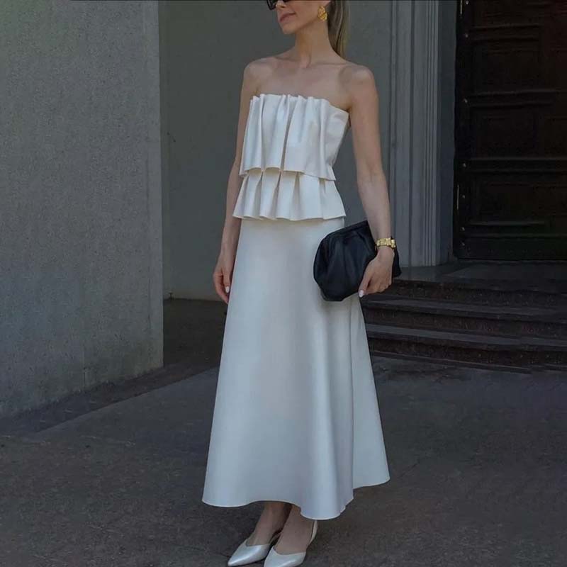 Белое плиссированное платье без бретелек, однотонное, с открытыми плечами, с защипами, модное, стройнящее, женское, пляжное, элегантное, длинное, для отдыха на пляже