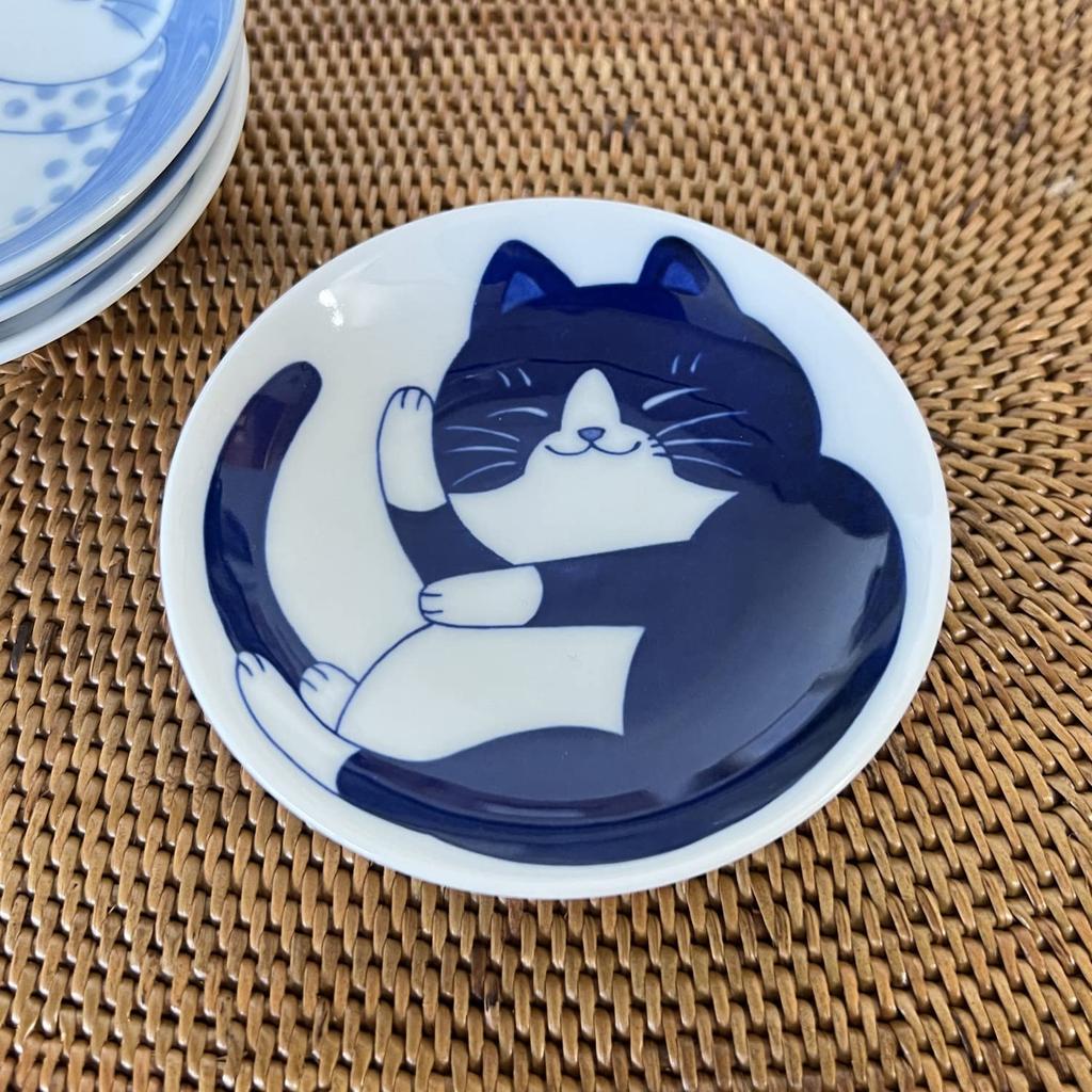 Fukubeya Mino Ware Nekogura Маленькая тарелка 10 см с рисунком кошки Тора Набор из 4 синих круглых тарелок Маленькая приправа для сладостей - Hachiware, Mike, Shima, -