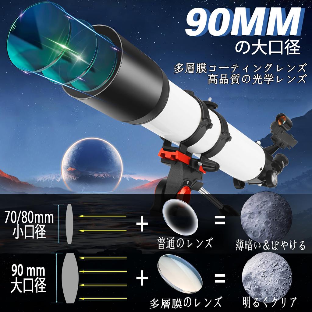 【90-миллиметровый многослойный оптический объектив】Апертура телескопа составляет 90 мм, а оптический объектив имеет полное многослойное покрытие, что позволяет улучшить яркость и четкость изображения.. Большая апертура позволяет улавливать больше света, а оптическая линза с высоким коэффициентом пропускания улучшает пропускание света и уменьшает отражение света, поэтому этот телескоп для взрослой астрономии более яркий.. Это даст вам четкое изображение.