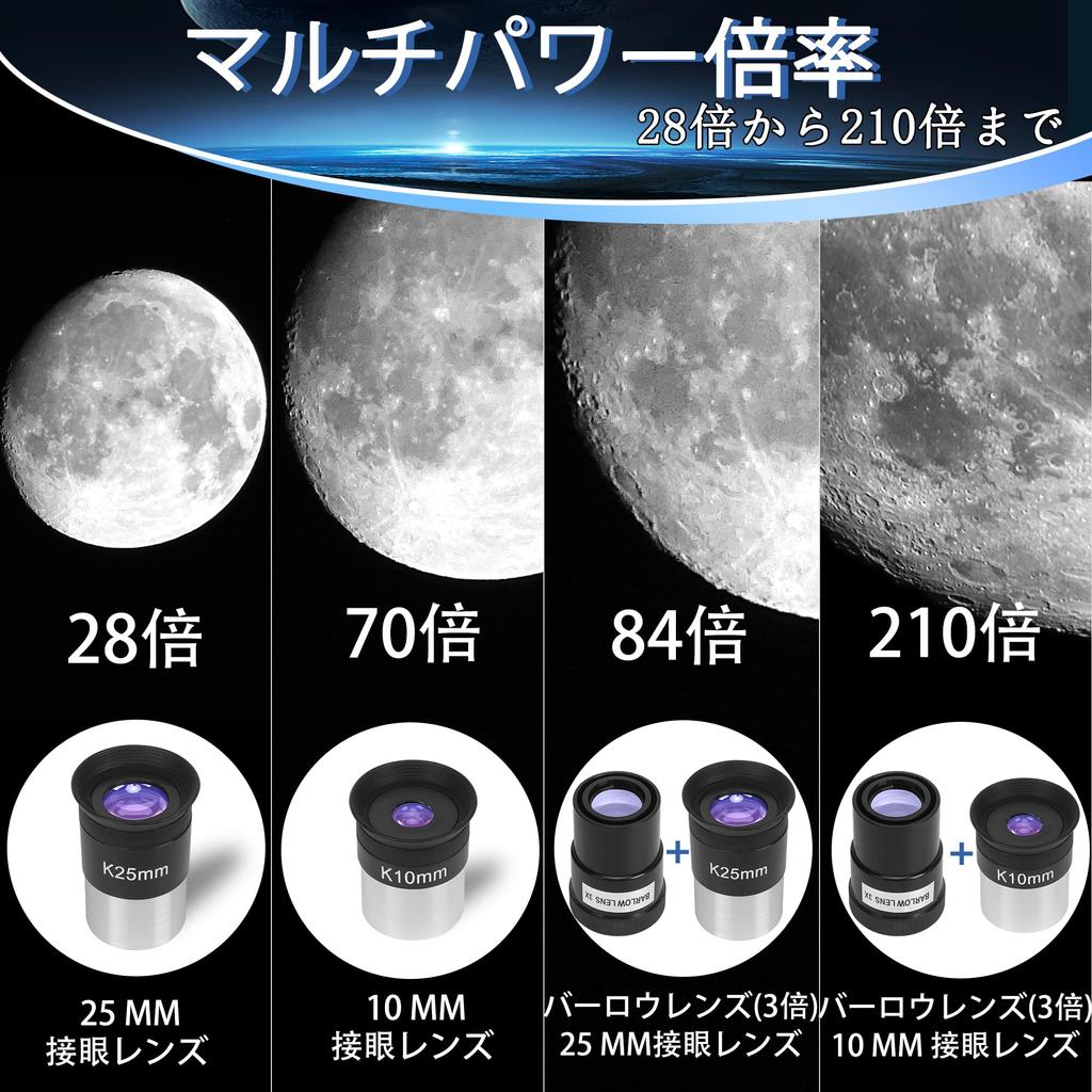 [Увеличение 28x - 210x] Оснащен 2 окулярами (К25мм/К10мм) и 3-кратная линза Барлоу. Фокусное расстояние телескопа составляет 700 мм, что обеспечивает высокое увеличение от 28x до 210x.. Этого увеличения достаточно, чтобы увидеть кратеры на Луне, Сатурне и Юпитере.