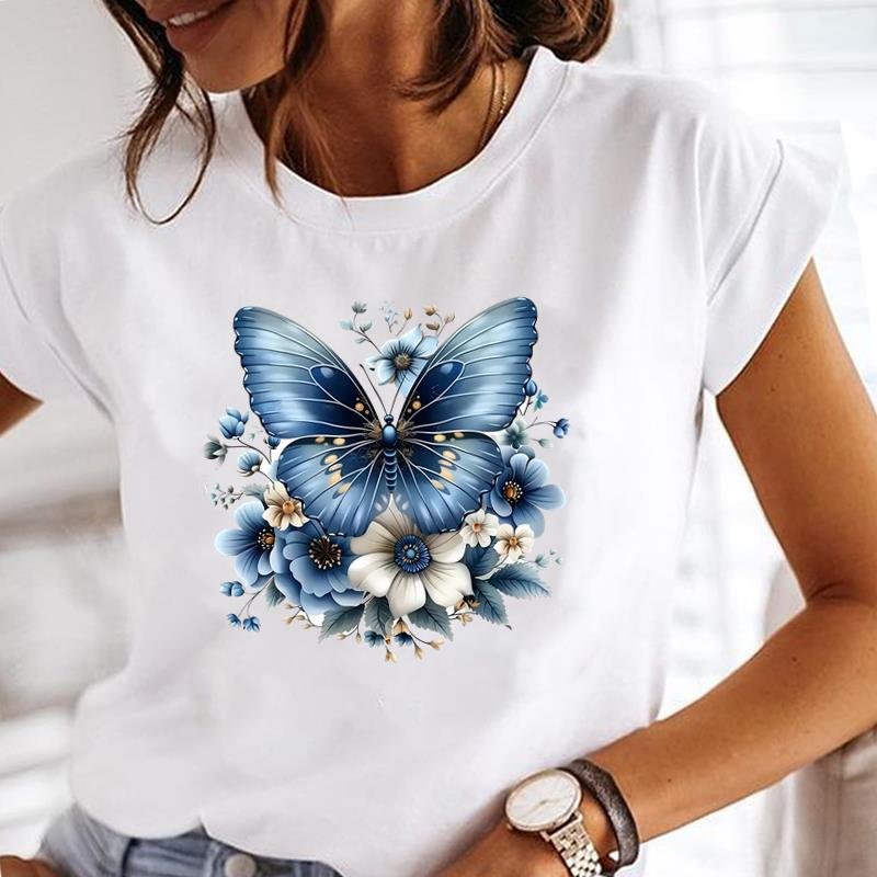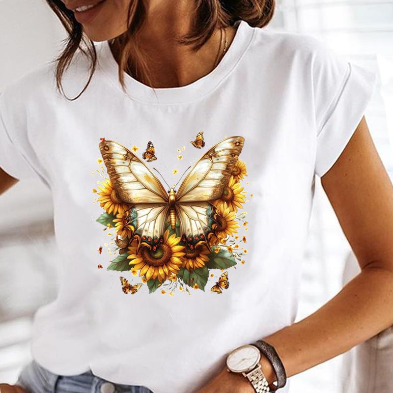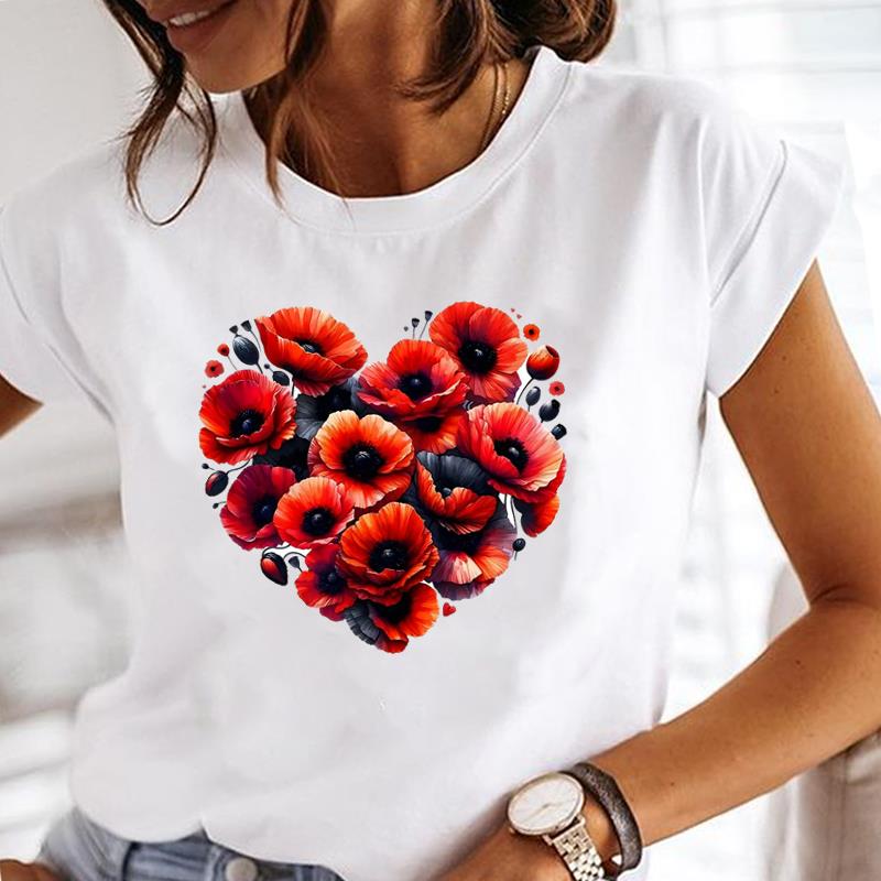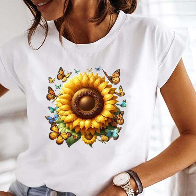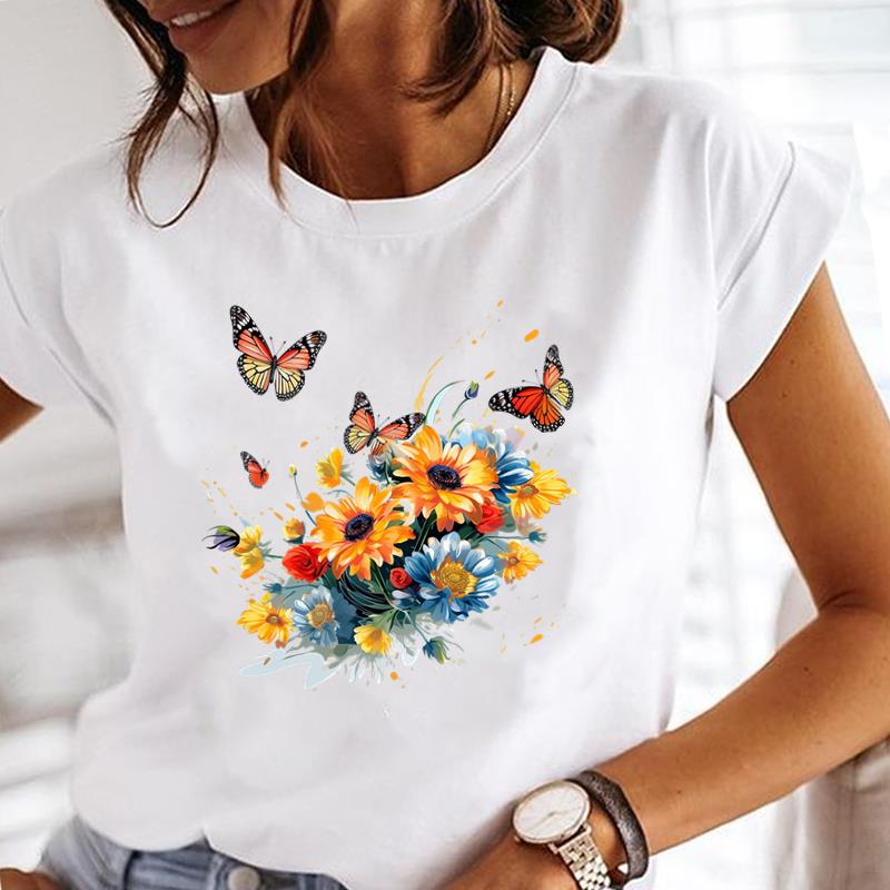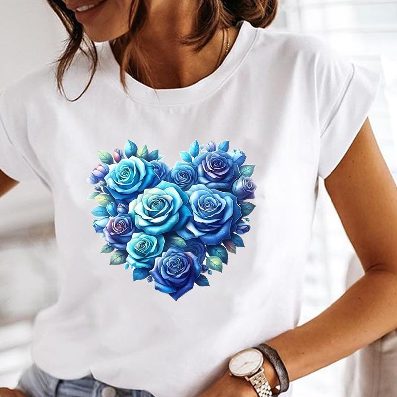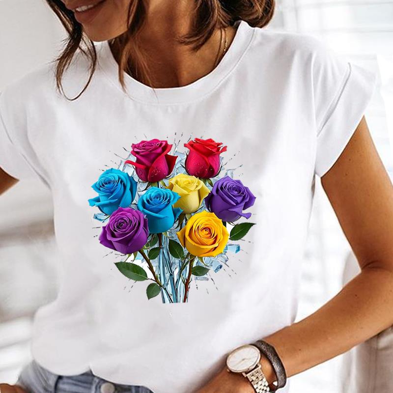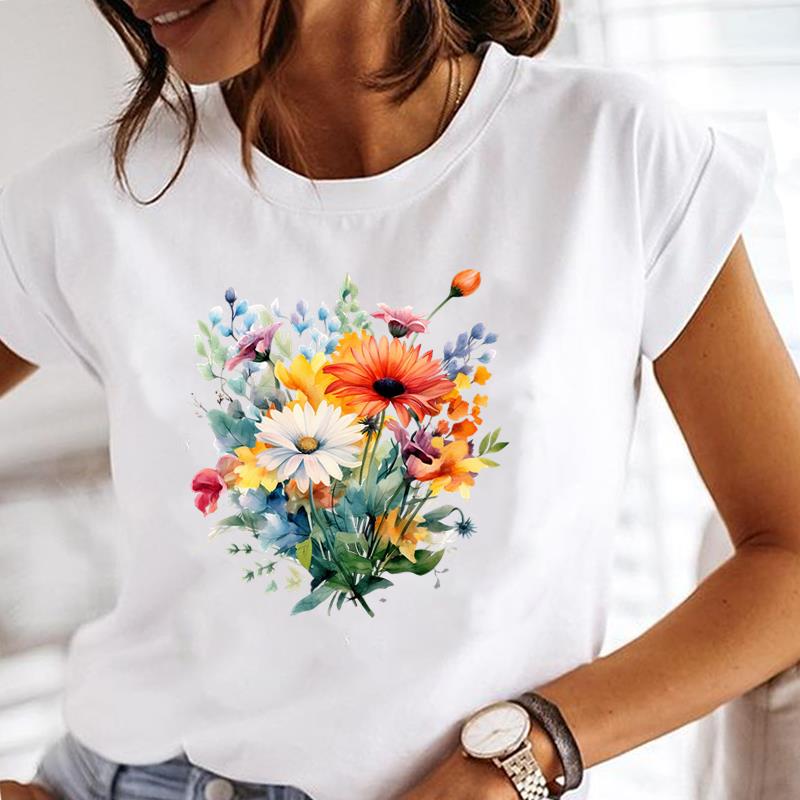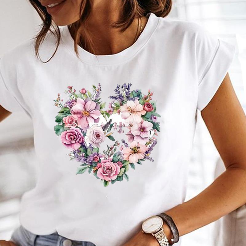 (Азиатский размер) Прекрасный цветочный тренд Графические футболки Футболка Женская верхняя одежда Повседневная Цветочная мода с коротким рукавом Принт Женская футболка