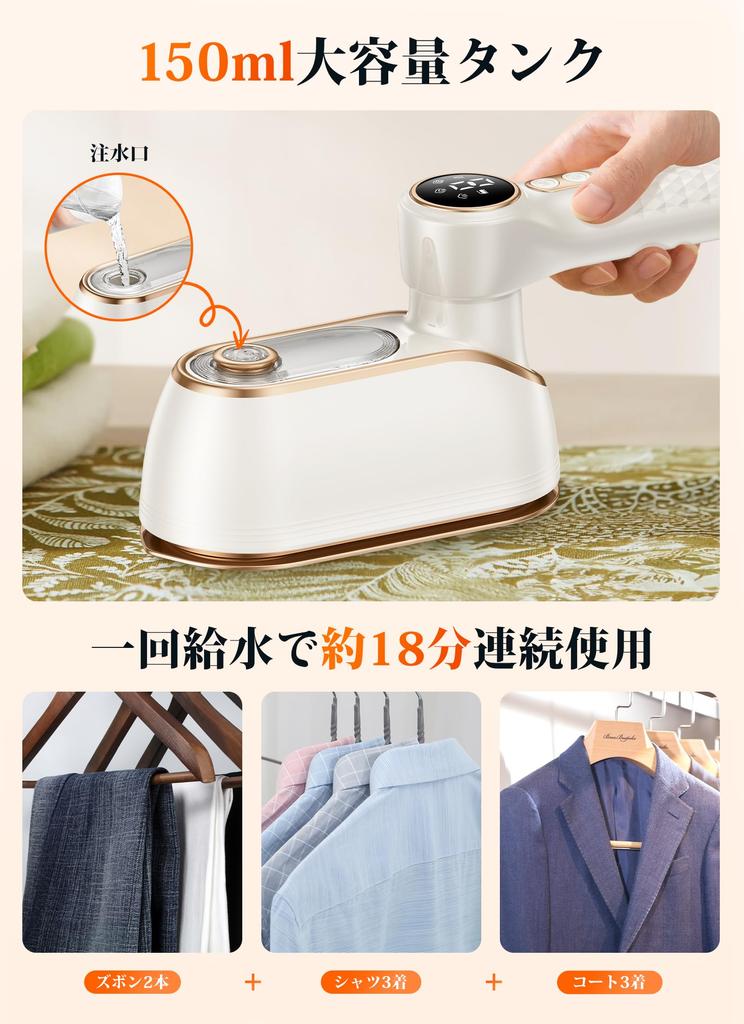 [Большая емкость 150 мл/удобная конструкция] Благодаря резервуару емкостью 150 мл его можно использовать непрерывно в течение около 18 минут с одной подачей воды.. Стабильная непрерывная подача пара независимо от того, как сильно вы наклоняете утюг на 360°, легко разглаживает складки, не беспокоясь о протечке воды.. Оба наконечника тонкие, что позволяет плотно прижимать воротники и складки одежды, что удобно для глажки небольших участков, например складок вокруг пуговиц.