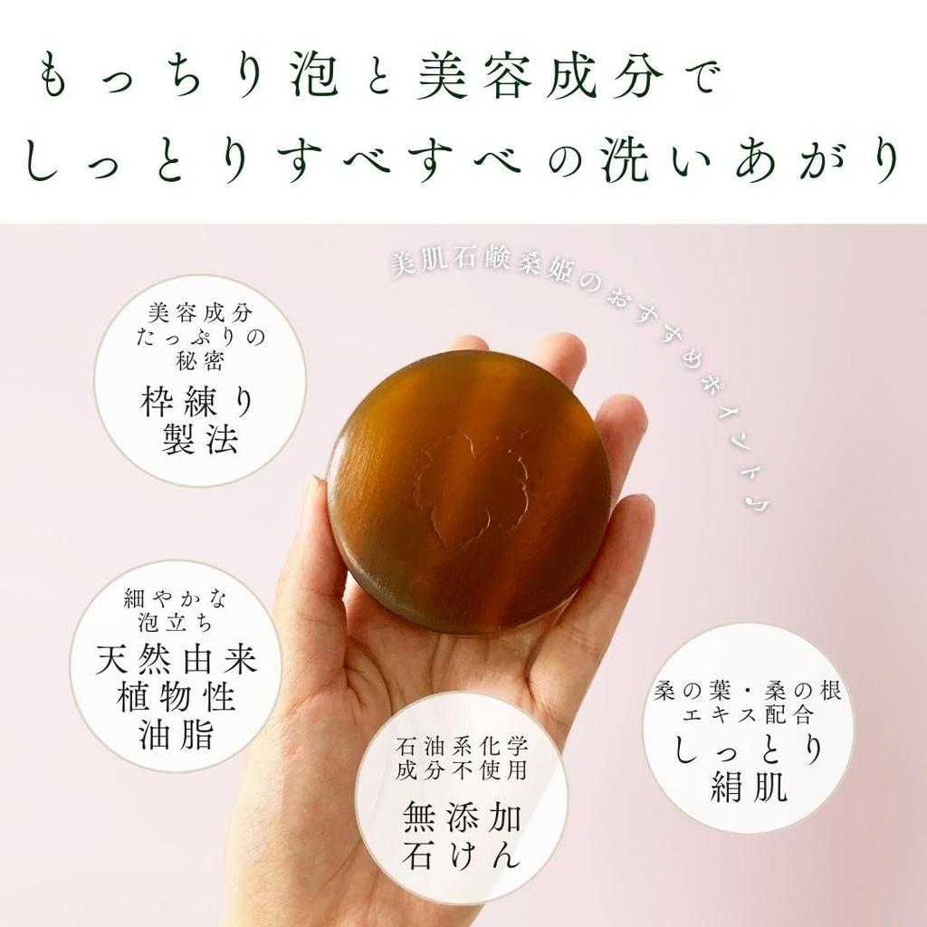 [Что такое мыло Beautiful Skin/Kuwahime]: Мыло, замешанное на рамке из растительных масел и жиров.. Мы уделяем особое внимание использованию натуральных ингредиентов, полученных из растений, не только для мыльной основы, но и для косметических ингредиентов, отдушек и красителей.. Не содержит минеральных масел, синтетических поверхностно-активных веществ на основе нефти, парабенов и феноксиэтанола. (консерванты). Его можно безопасно использовать людям с чувствительной кожей и маленьким детям.