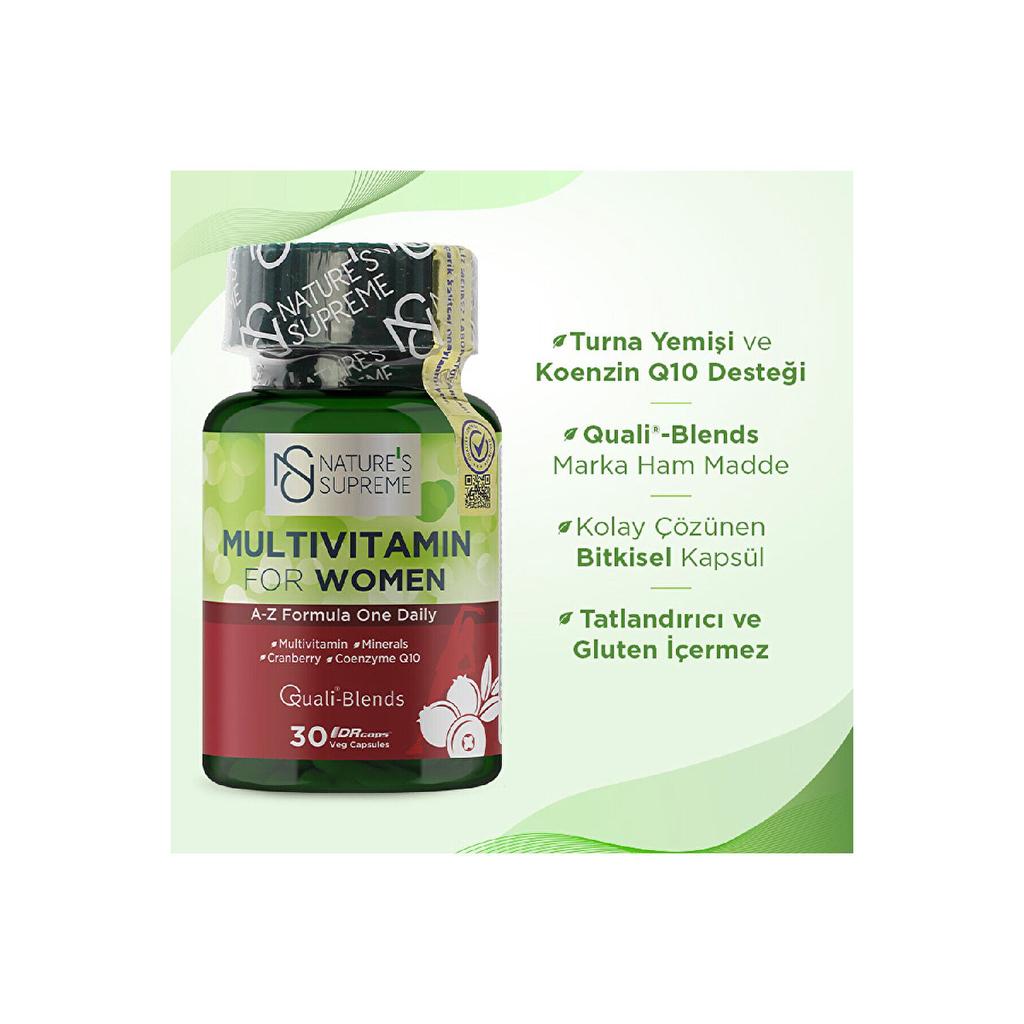 Мультивитамины для женщин Nature's Supreme, которые содержат больше витаминов и минералов, чем те, которые ежедневно требуются женщинам, следует добавить к коэнзиму Q10 и журавлиному блюду. (клюква).