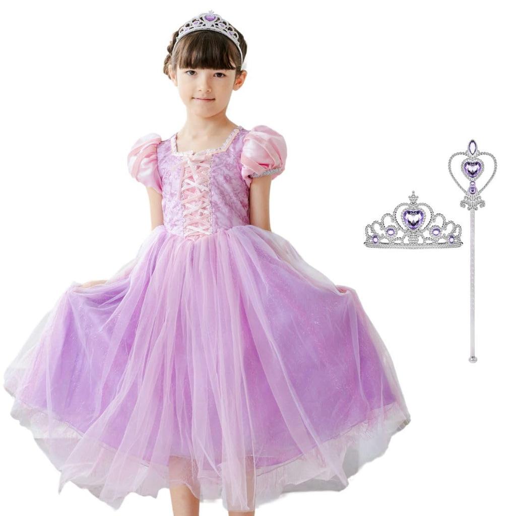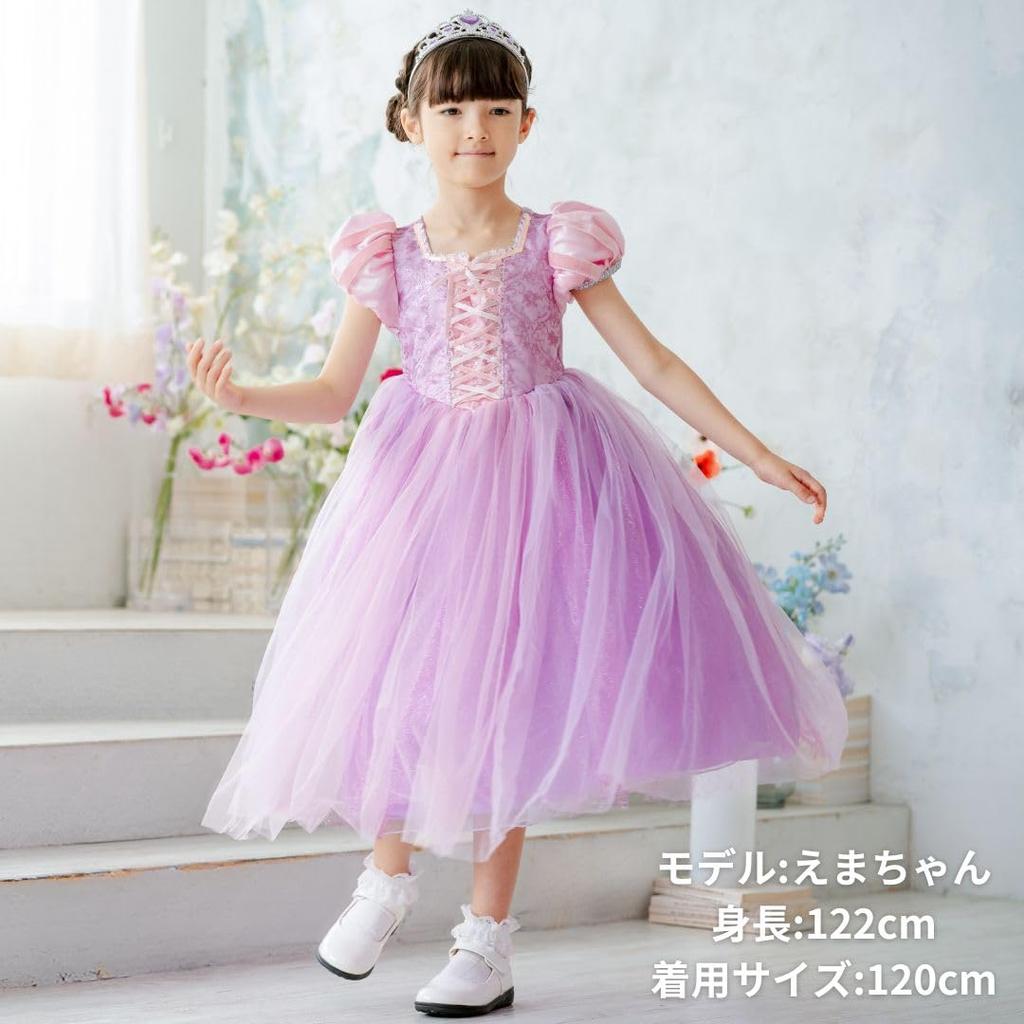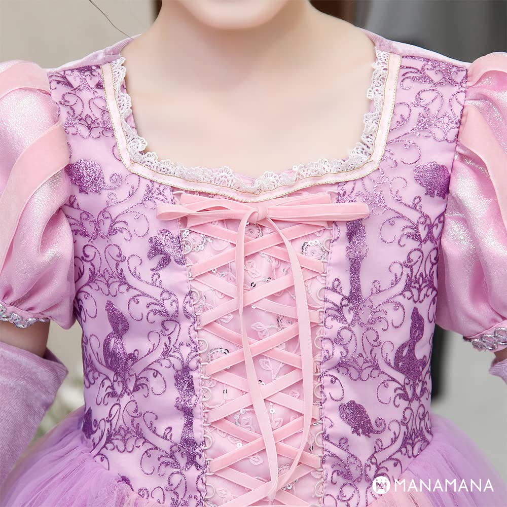 Ленточные кружева спереди аккуратные и аккуратные, воспроизводят платье Рапунцель.. Юбка состоит из 6 слоев, включая фатин на внутренней стороне, что придает ей пышность и объем, а нюансы оттенков розового и фиолетового придают ей элегантный вид.. На корпусе имеется светло-фиолетовый отпечаток Паскаля. (хамелеон) с блестками, что придает ему великолепный вид.