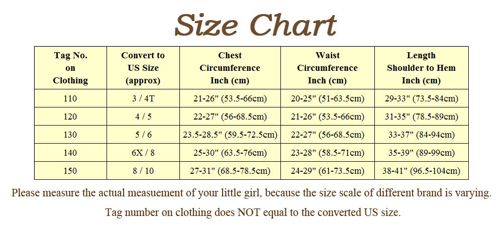 Размеры для девочек ясельного возраста и маленьких детей: 110 (3-4 года), 120 (4-5 лет), 130 (5-6 лет), 140 (7-8 лет), 150 (9-10 лет) Возраст — это руководство по размеру. Пожалуйста, измерьте свой фактический размер и воспользуйтесь таблицей размеров, чтобы выбрать наиболее подходящий размер.. Возможны небольшие погрешности в зависимости от способа измерения размера.